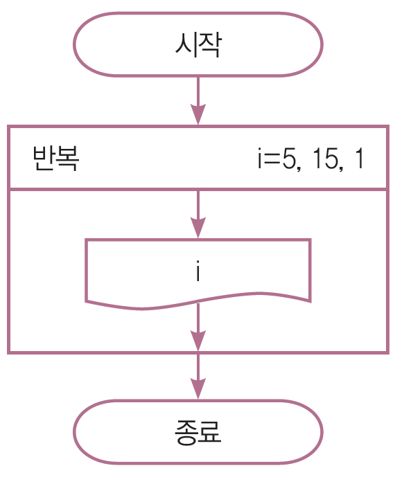 5부터 15까지 출력하는 순서도와 파이썬 프로그램을 작성하세요.
