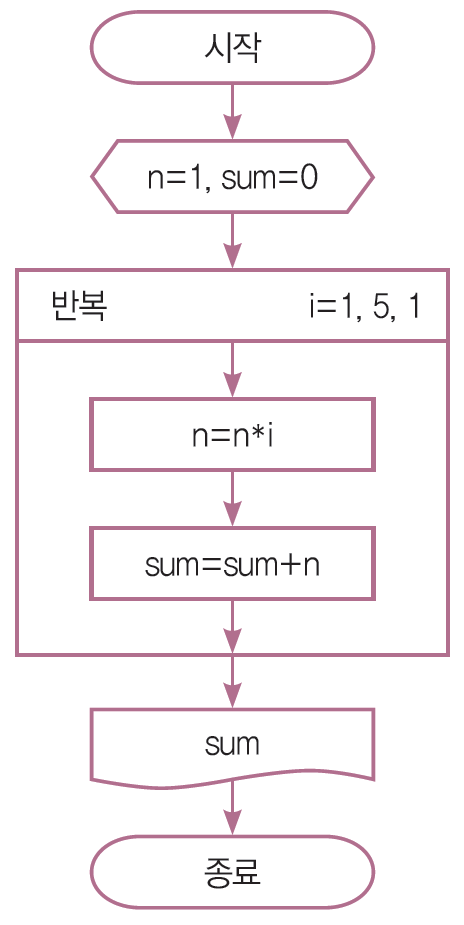 1!, 2!, 3!, 4!, 5!의 합을 출력하는 순서도와 파이썬 프로그램을 작성하여라.