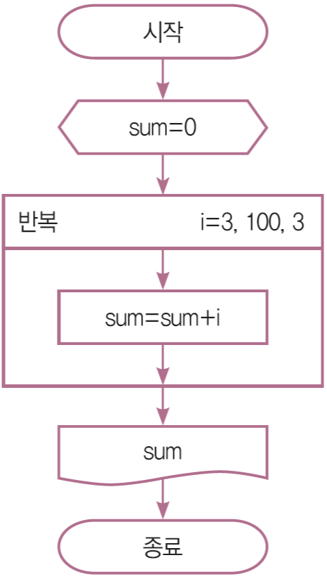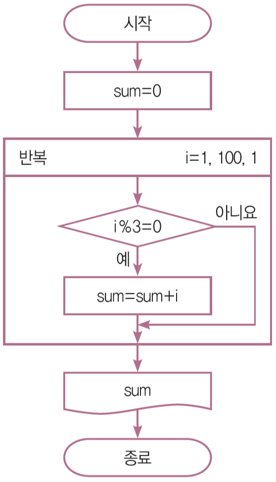 1부터 100까지의 수 중 3의 배수의 합을 출력하는 순서도와 파이썬 프로그램을 작성하여라.