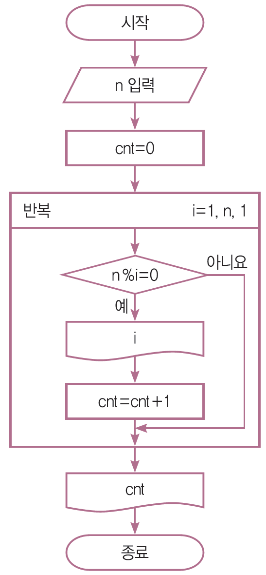 입력받은 숫자의 약수와, 약수의 개수를 출력하는 순서도와 파이썬 프로그램을 작성하여라.