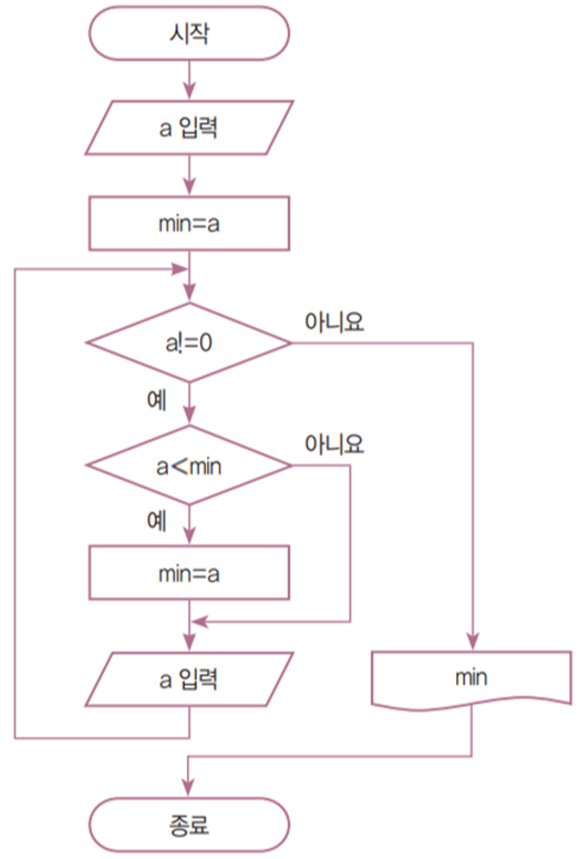 최솟값을 구하는 순서도와 파이썬 프로그램을 작성하여라.