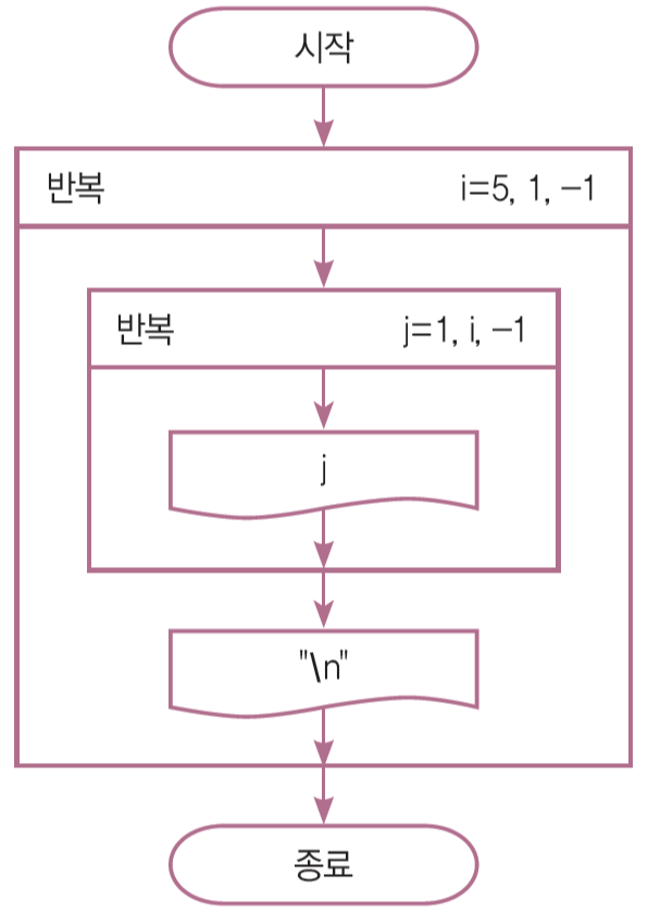 - i 값이 5부터 1씩 감소하며 1이 될 때까지 반복한다.