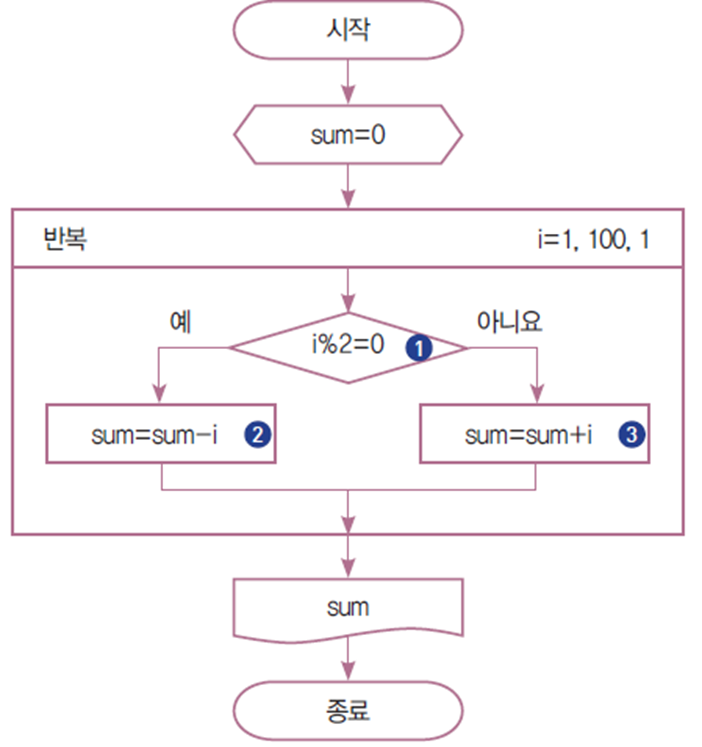 i가 1부터 1씩 증가하며 100이 될 때까지 반복하며 i가 짝수인 경우 sum에 i 값을 누적한다.