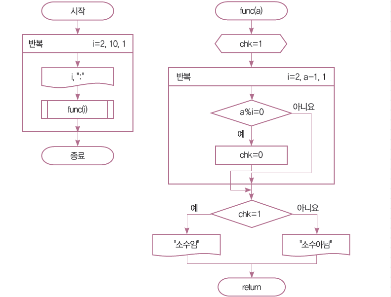 소수 판별하는 함수를 이용해서 2부터 10까지의 수에 대해 소수인지 아닌지를 출력하는 순서도와 파이썬 프로그램을 성하여라.