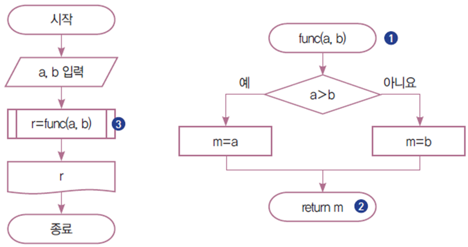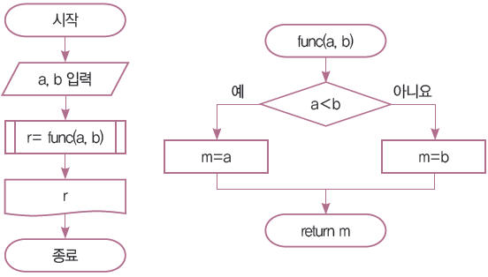함수를 이용해서 두 수중 작은 수를 찾는 순서도와 파이썬 프로그램을 작성 하여라.