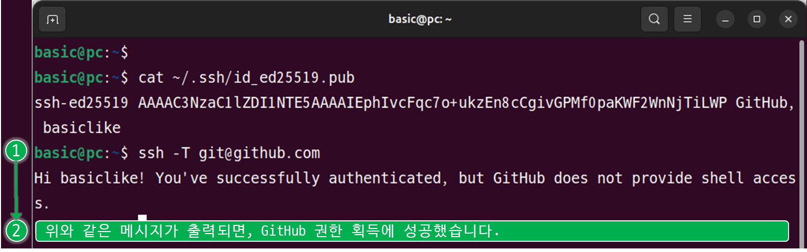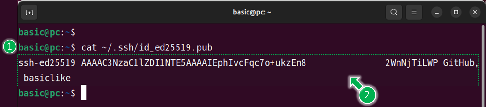 ① 아래 명령어로 공개 키 확인, ② 출력된 내용을 전체 복사합니다.