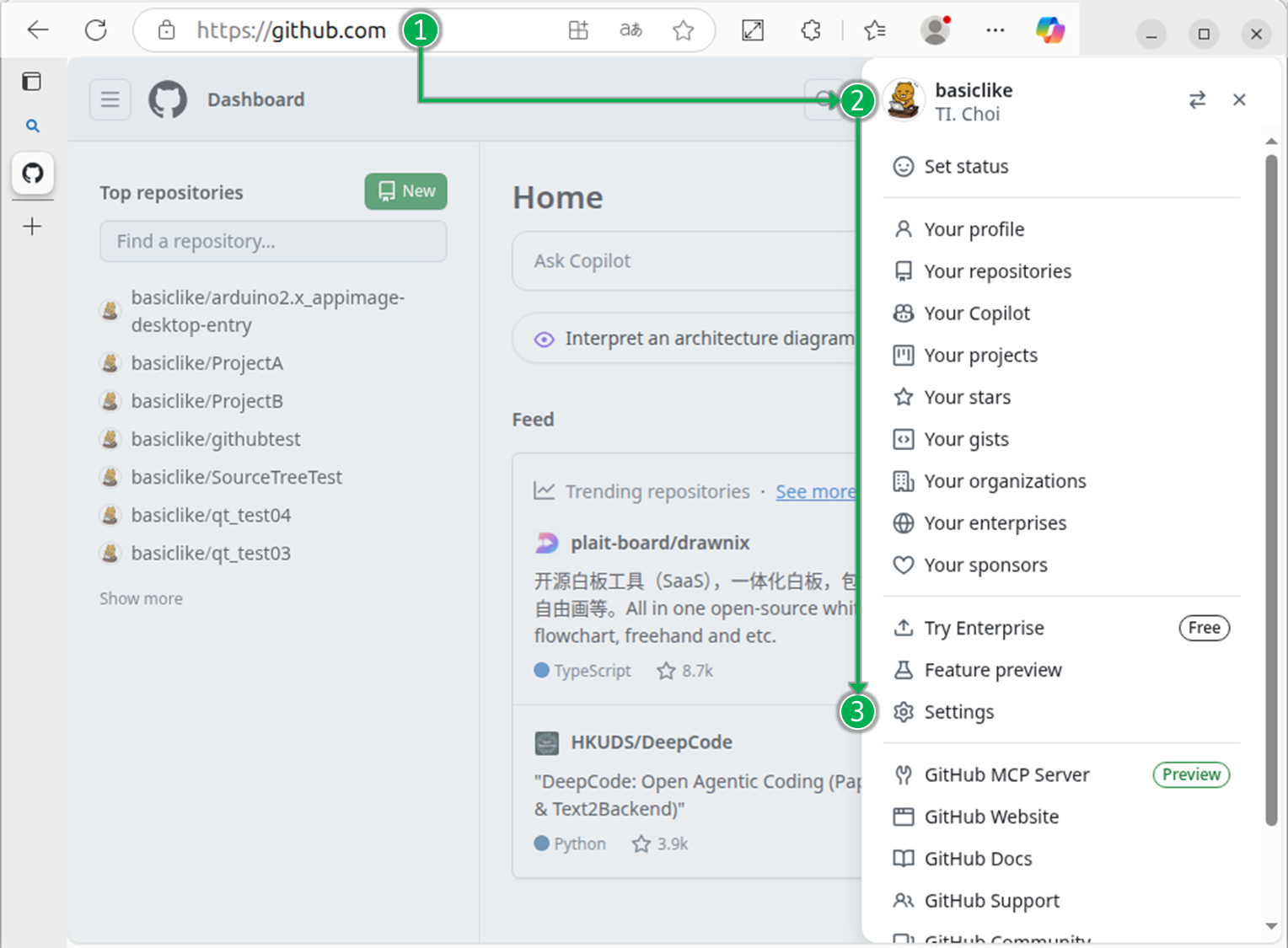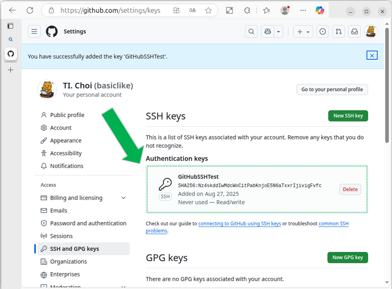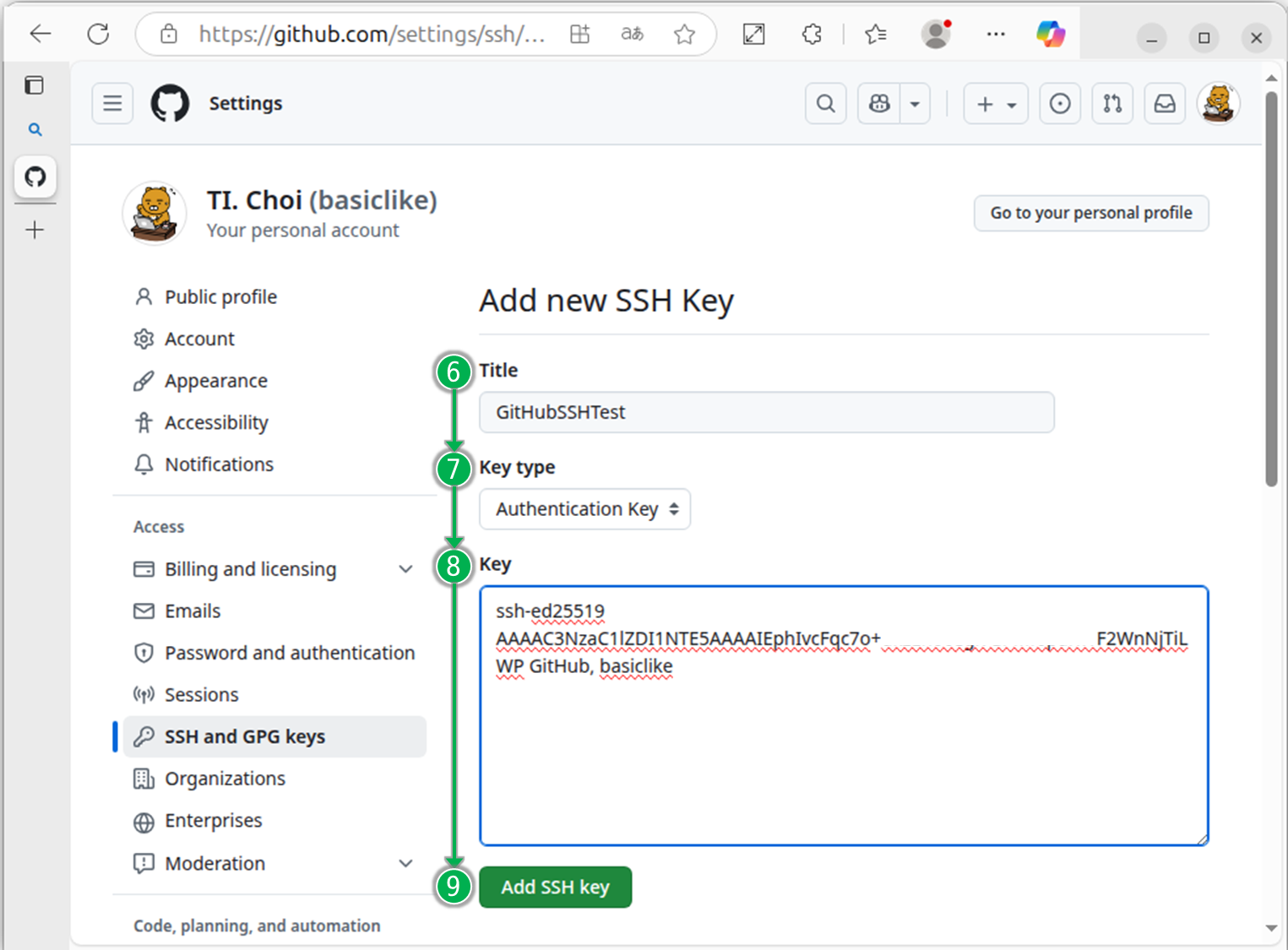 GitHub → [Settings] → [SSH and GPG keys] → "New SSH key" → 붙여넣기