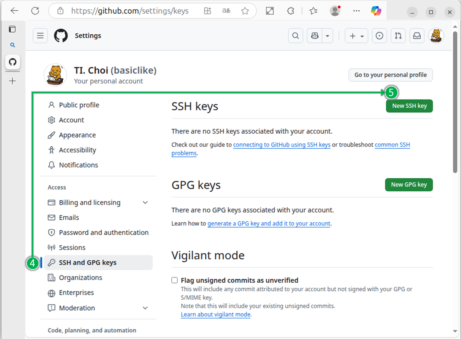 GitHub → [Settings] → [SSH and GPG keys] → "New SSH key" → 붙여넣기