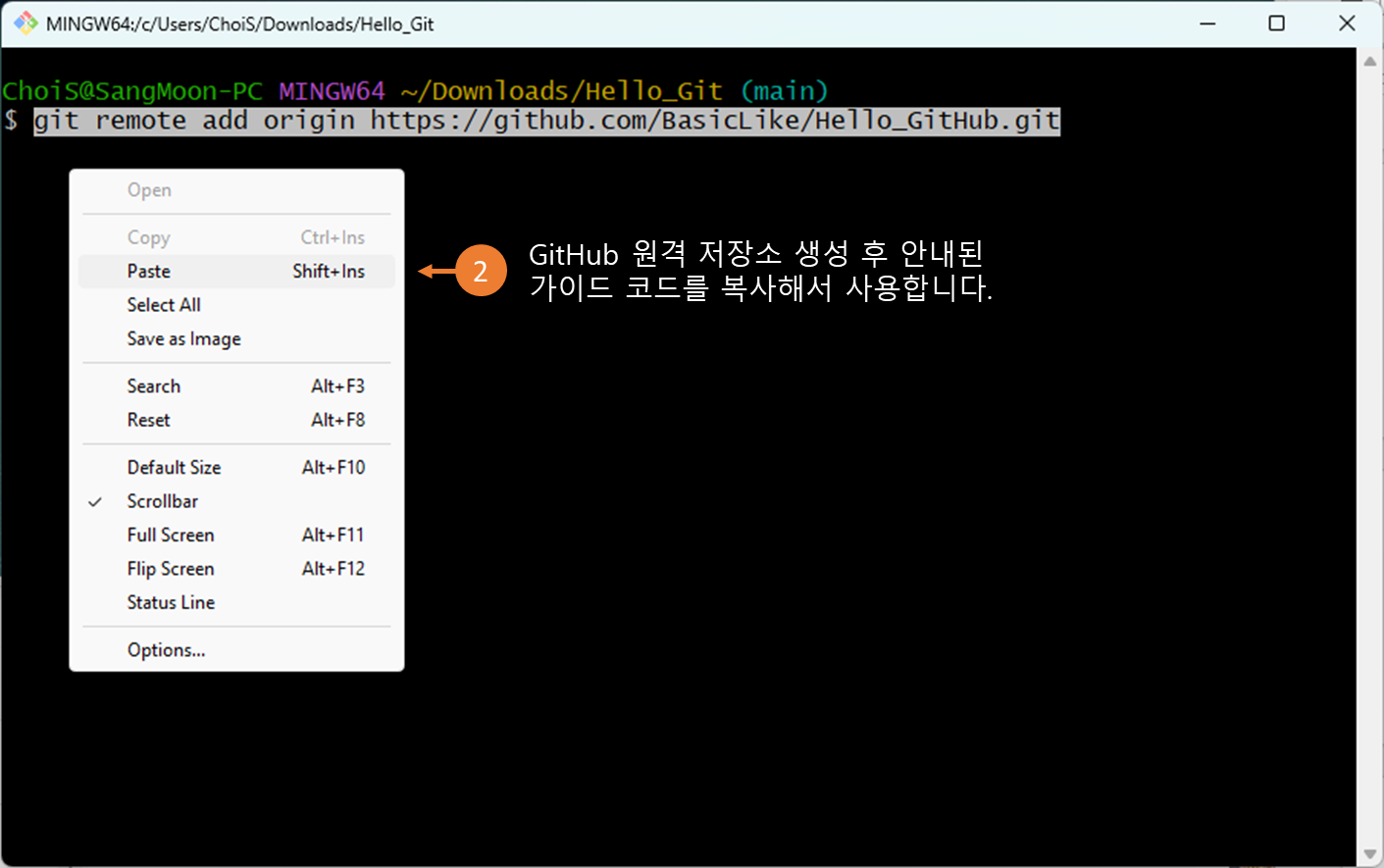 @GitHub 원격 저장소 생성시, 8번 9번 가이드 코드를 복사해서 사용합니다.