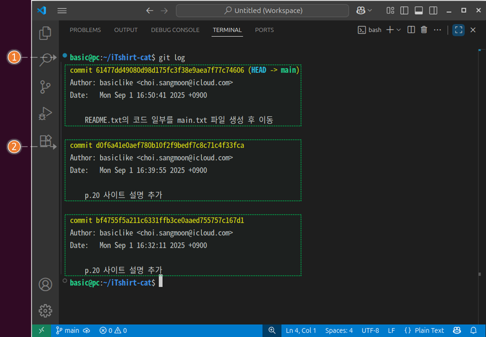 ② 다음 명령어를 입력해 두번째 커밋 로그를 확인합니다.