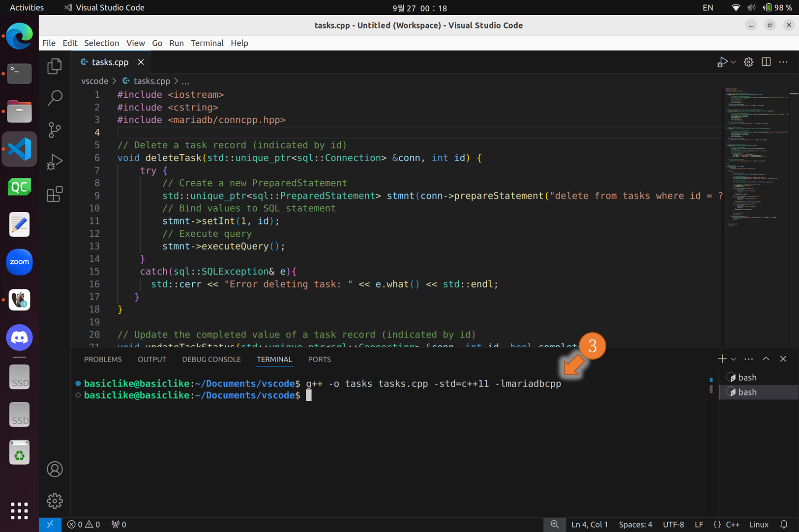 g++ -o tasks tasks.cpp -std=c++11 -lmariadbcpp