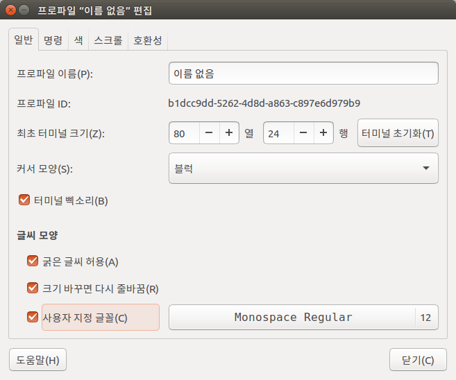 사용자 지정 글꼴을 체크하고 현재 설정된 폰트 이름인 "Monospace Regular 12"를 클릭합니다.