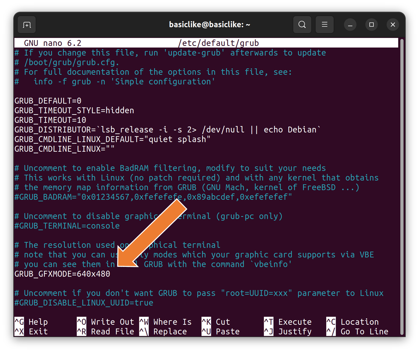여기에 GRUB_GFXMODE=640x480 주석을 제거 합니다.