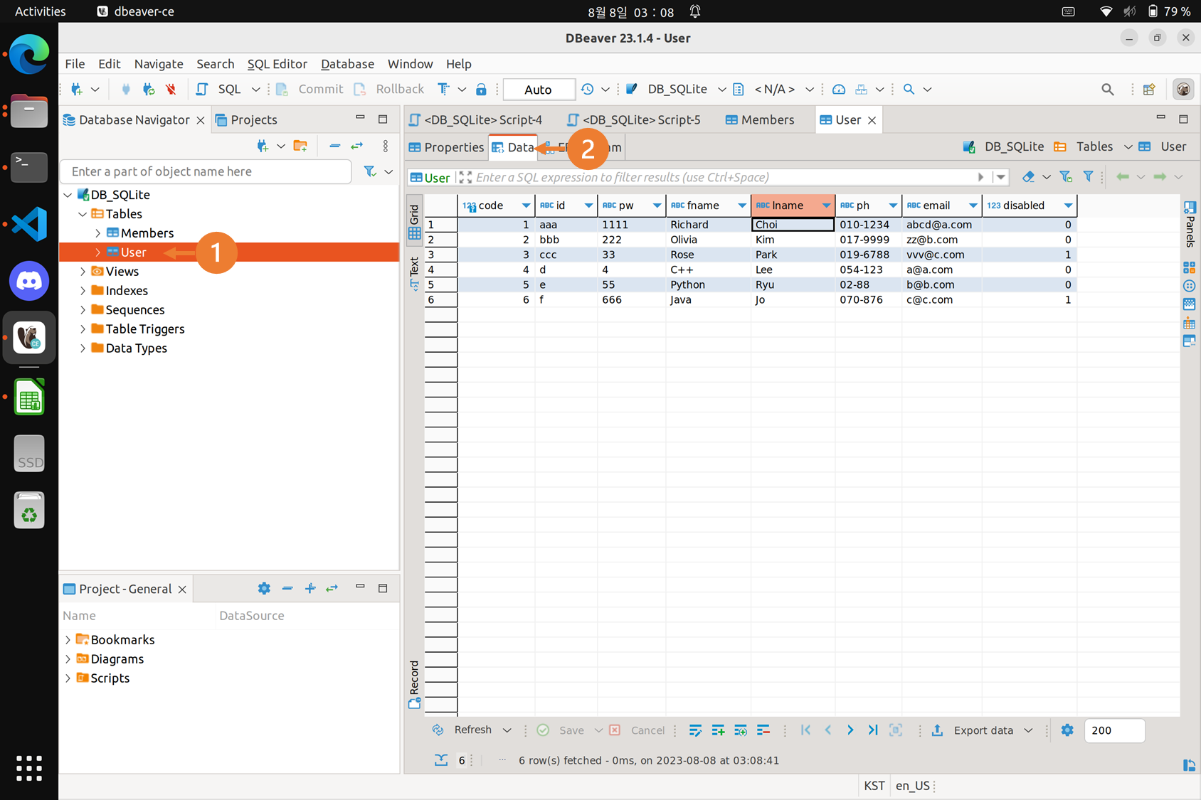 - User 테이블, Data 탭을 확인