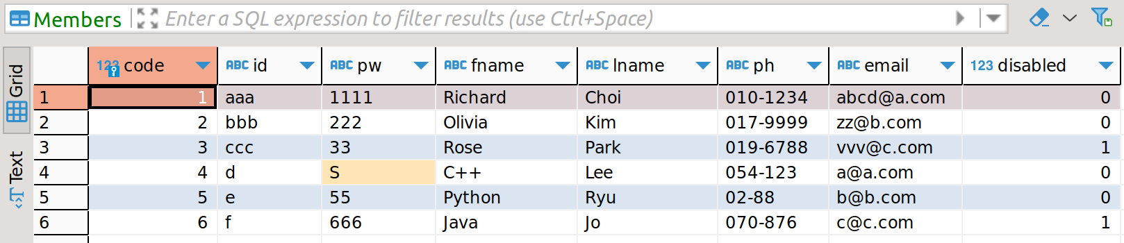 (1, 'aaa', '1111', 'Richard', 'Choi', '010-1234', 'abcd@a.com', 0),