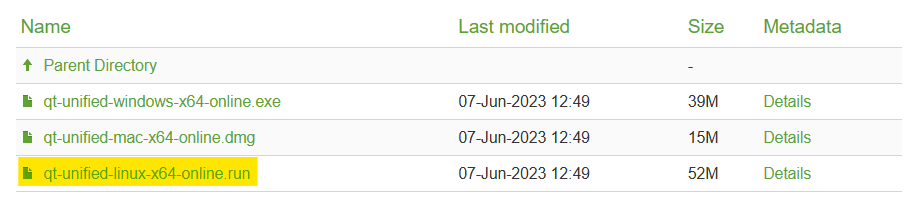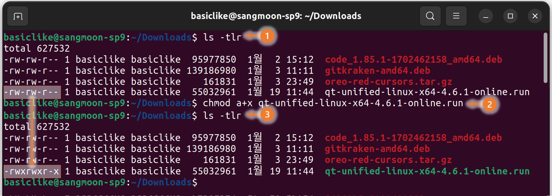 아래 이미지처럼 Qt 설치 파일의 권한에, x 가 없는 상태가 출력되하면 아래 명령어 실행