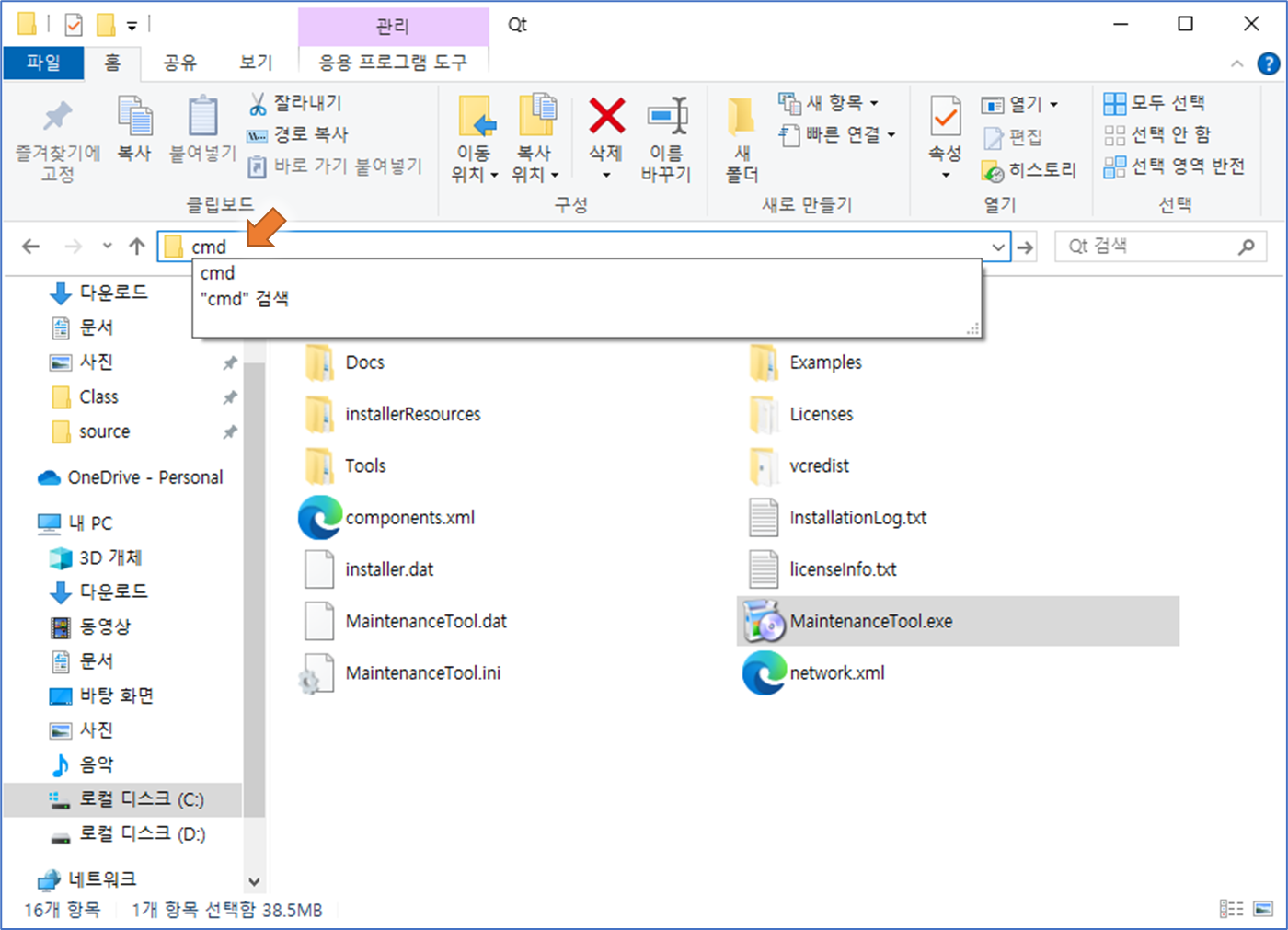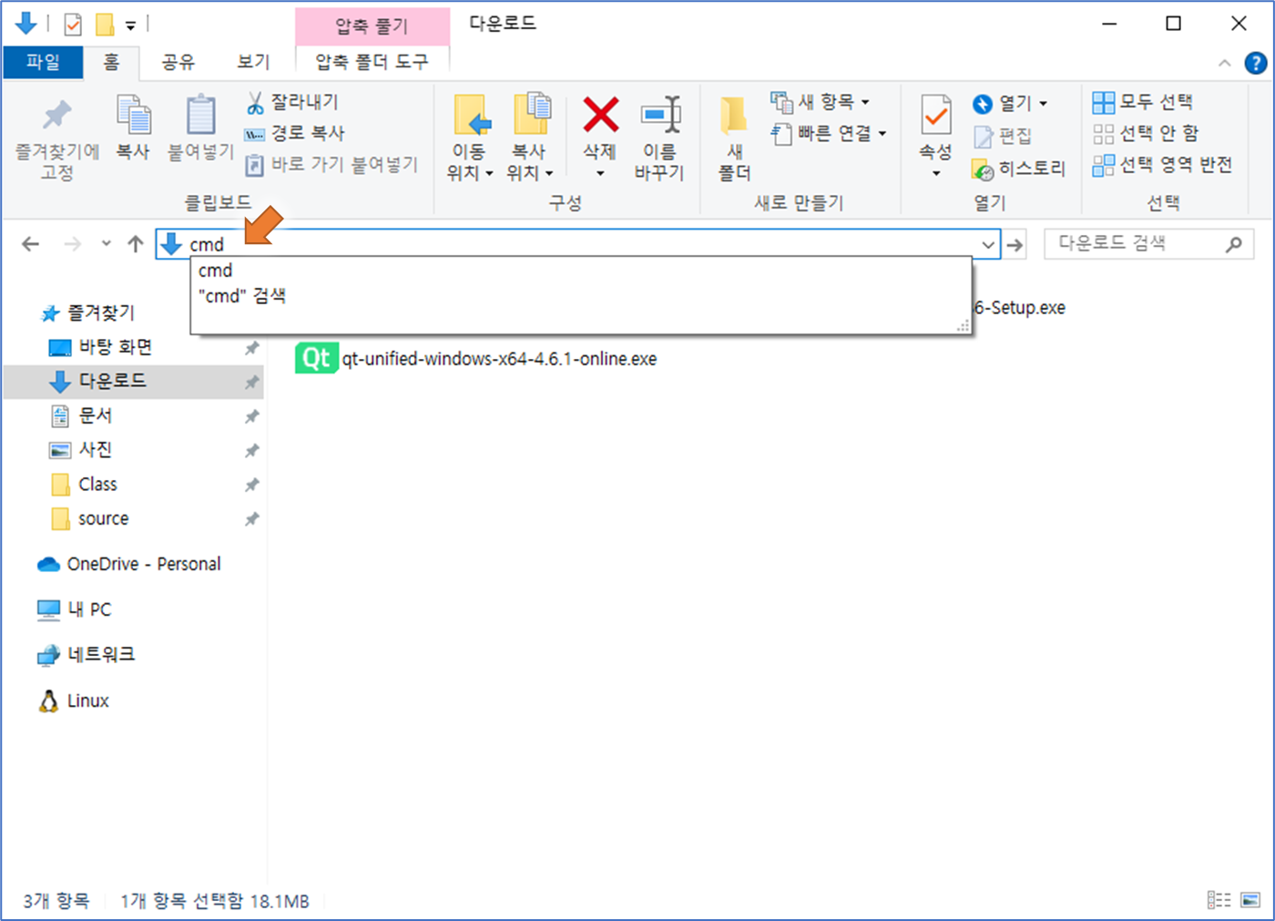 1. Online Installer가 설치된 경로로 이동하여, 주소창에 "cmd" 를 입력하여 터미널을 실행시킨다.