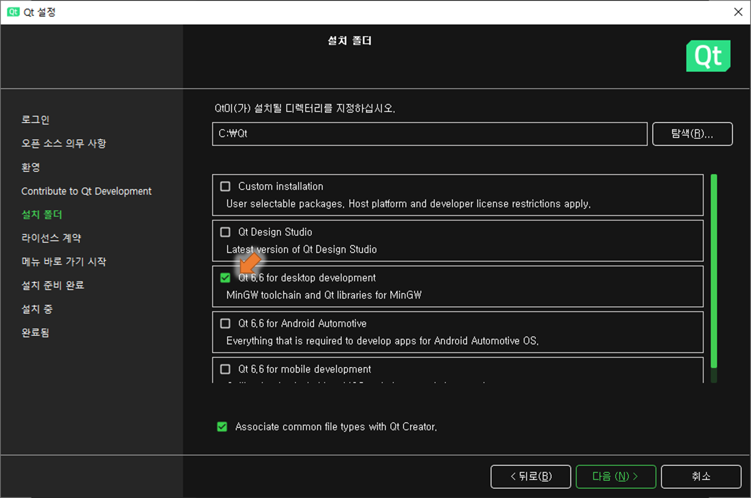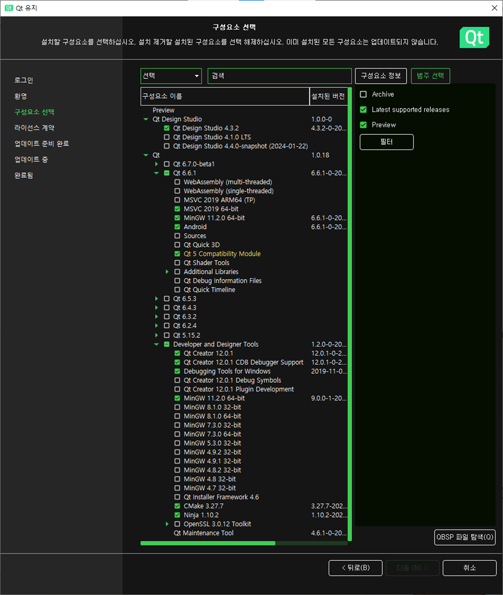 아래 <Android>, <Qt 5 Compatibility Module> 컴포넌트만 제외하면 위의 선택과 동일하다다.