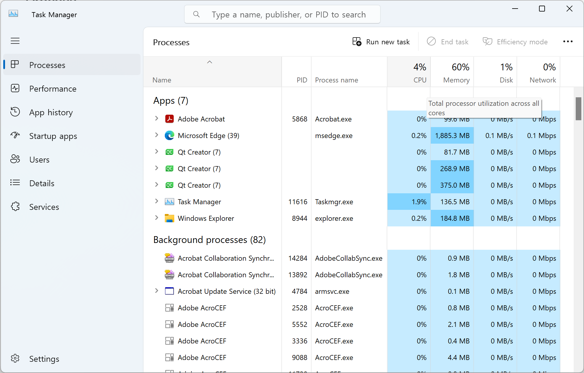 Process 탭에서 실행중인 프로그램의 프로세스 상태를 확인할 수 있다.