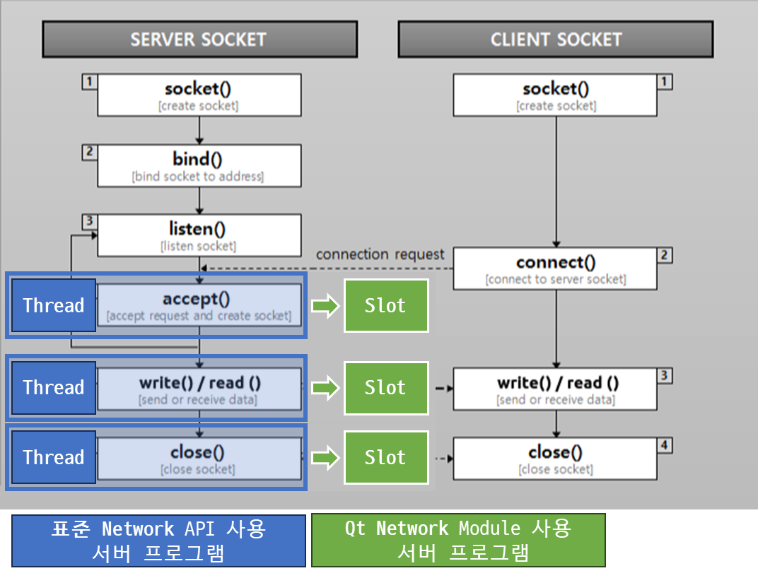 - 오른쪽은 Qt 에서 제공하는 Qt Network Module을 이용해 구현하는 방식