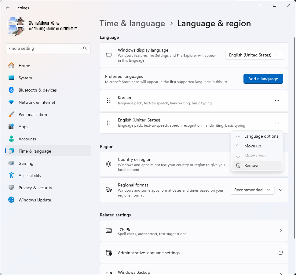 Add a language 에서 언어를 english (united states) 로 설치하고 삭제하면, 입력에서 레이아웃이 제거된다.