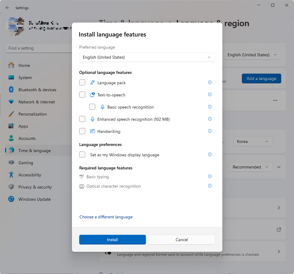 윈도우 기본 언어를 English, 입력을 Korean 으로 쓰게 되면
