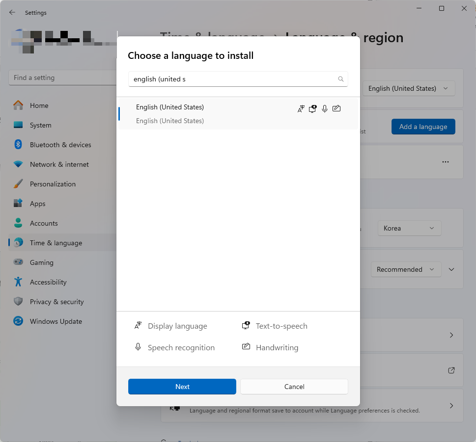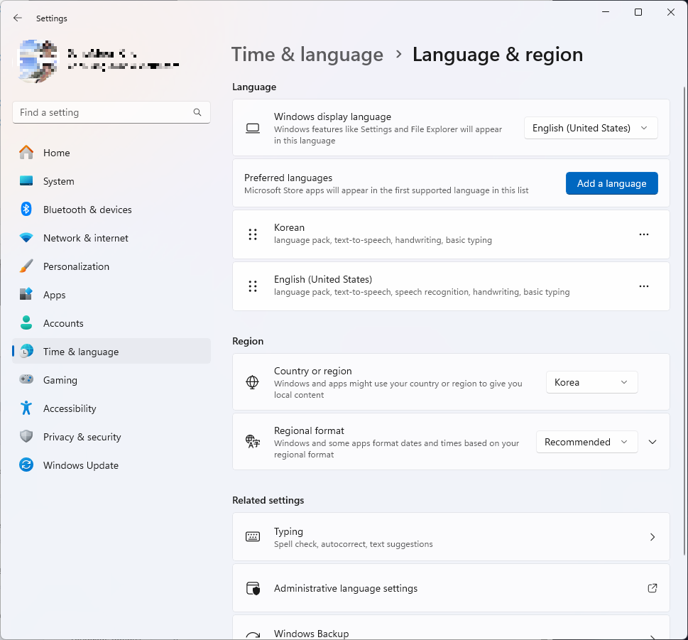 ② Time & language >> Language & region