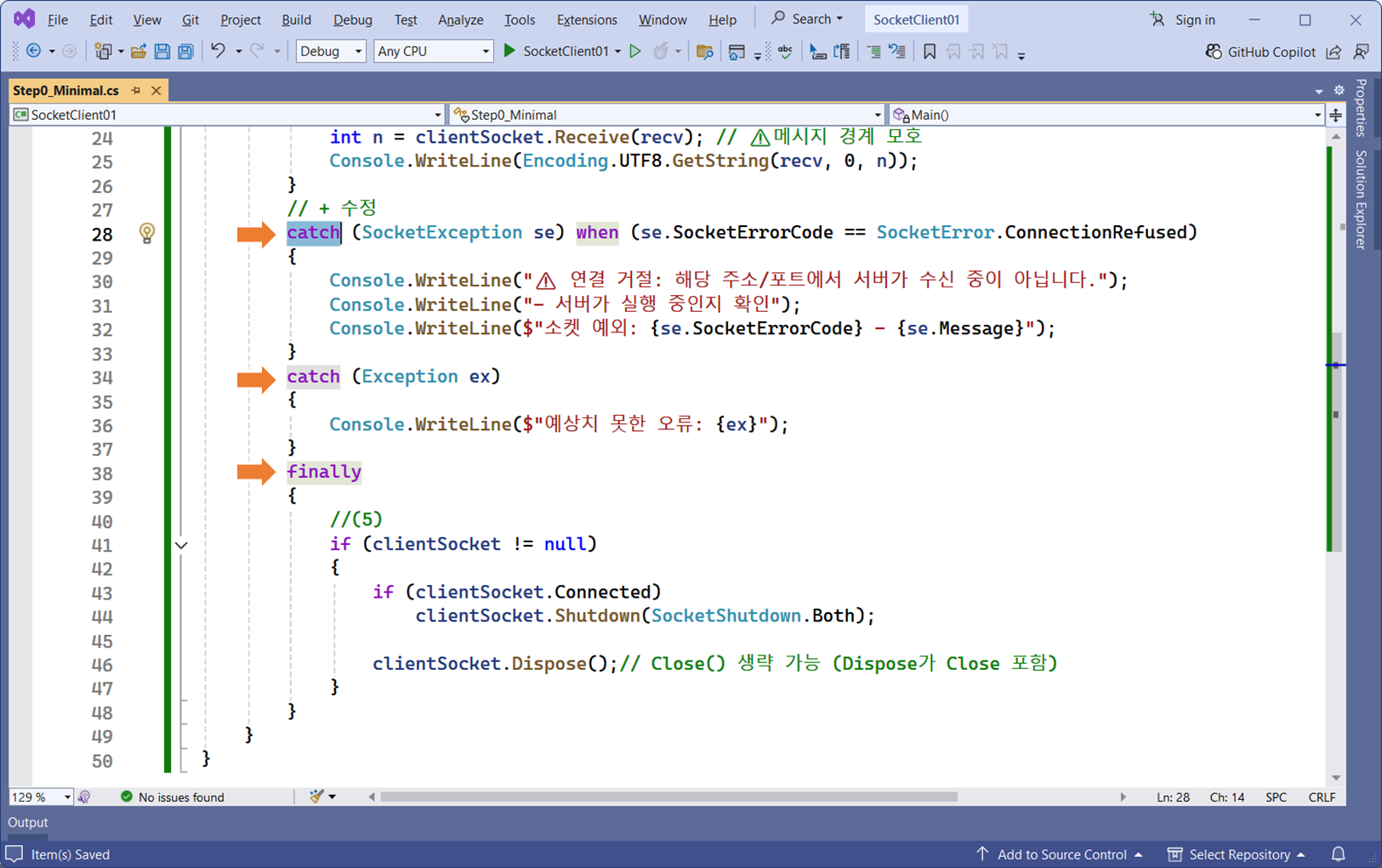 Console.WriteLine($"소켓 예외: {se.SocketErrorCode} - {se.Message}");