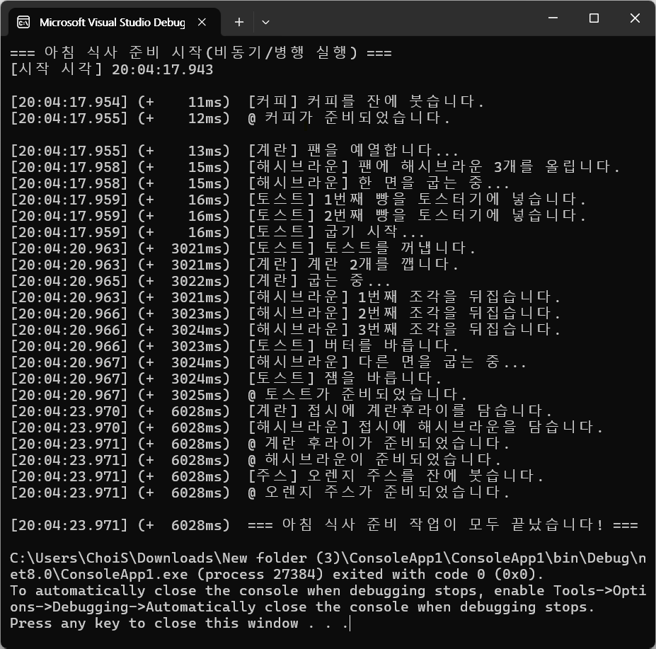 Console.WriteLine("=== 아침 식사 준비 작업이 모두 끝났습니다! ===");