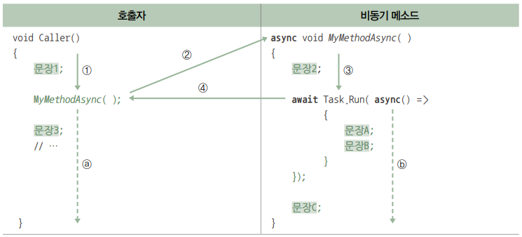 비동기 API를 await할 때, 해당 await가 아직 완료되지 않았으면 그 시점에서 호출자에게 제어가 반환됩니다. - await는 “병렬 실행”을 만드는 키워드가 아닙니다.