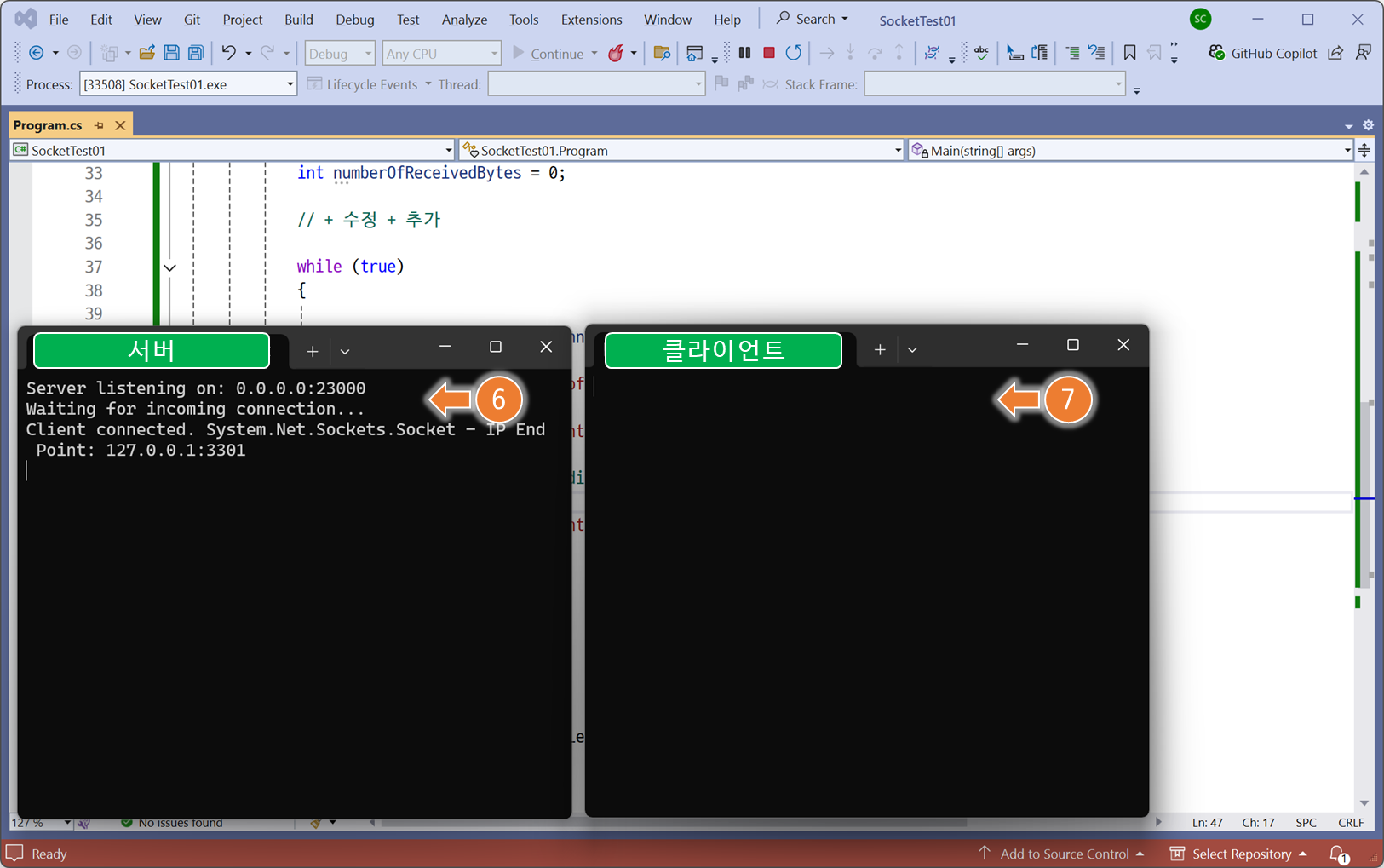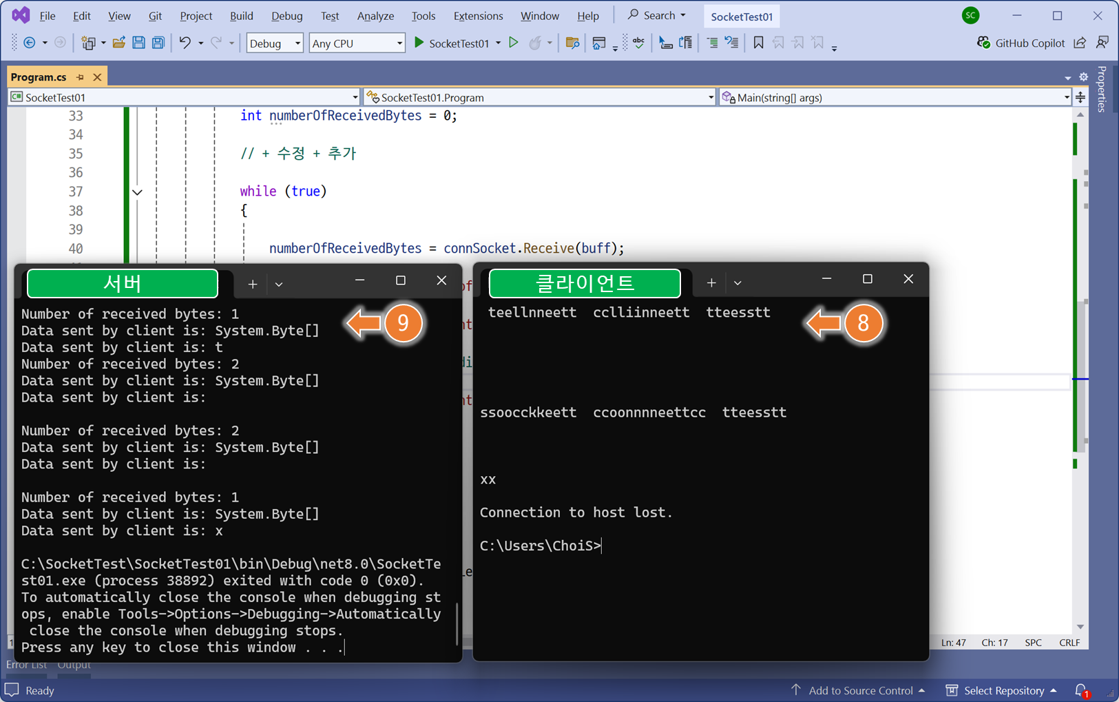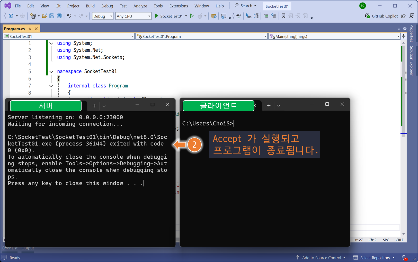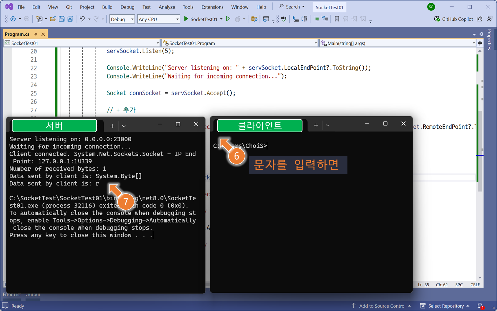 서버에, 클라이언트 연결 후 문자하나를 입력받는 코드를 추가합니다.