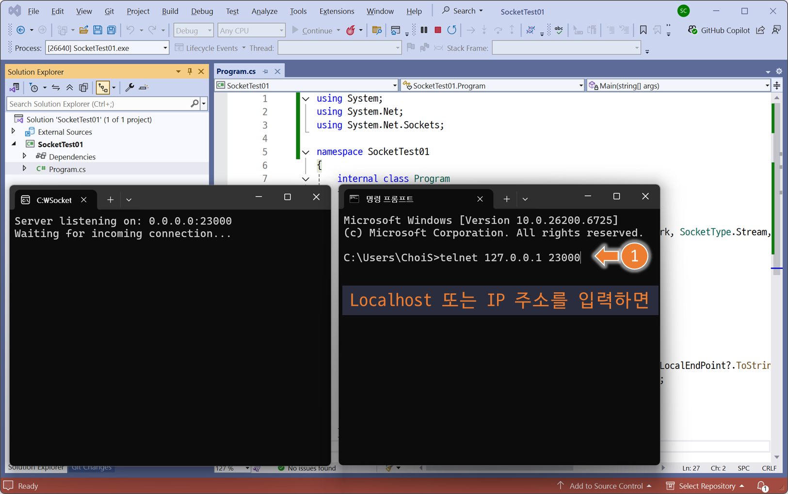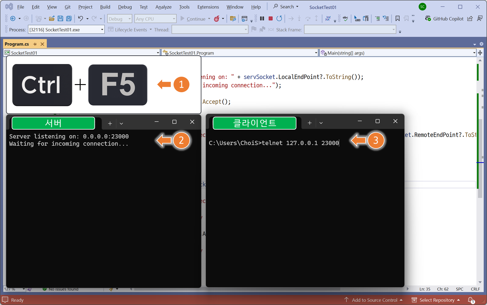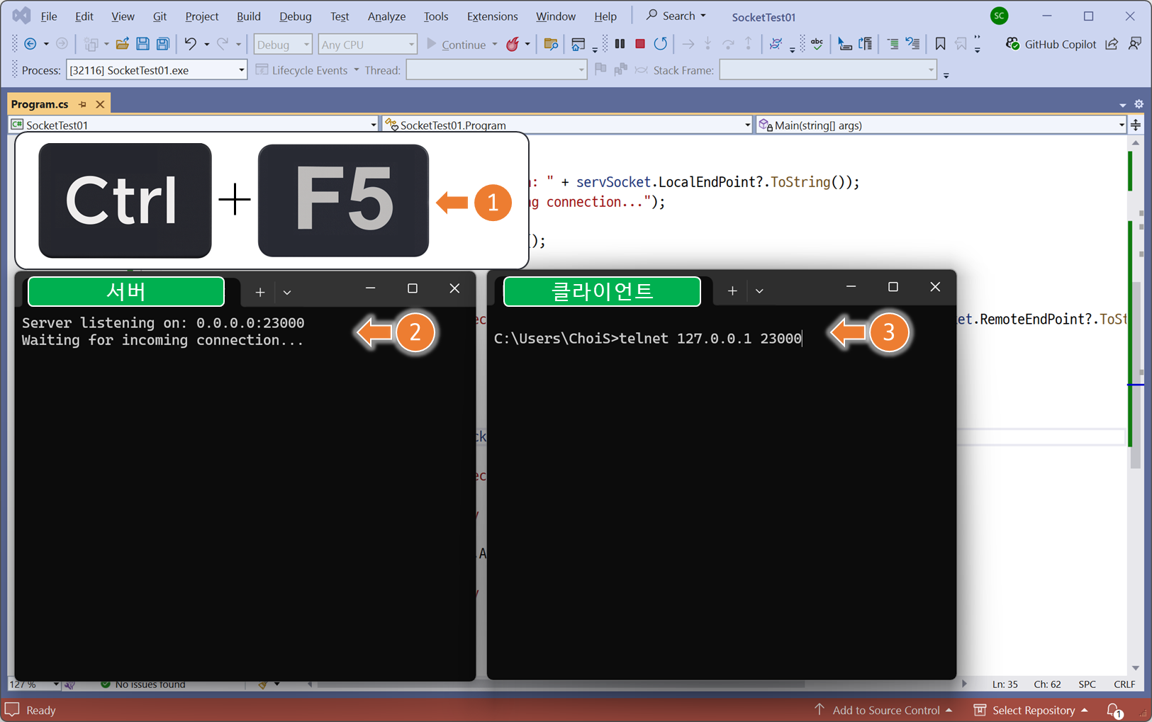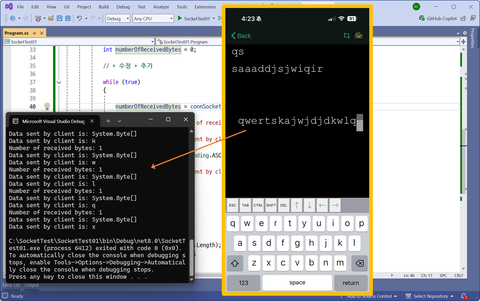 서버에, 클라이언트 연결 후 문자하나를 입력받는 코드를 추가합니다.