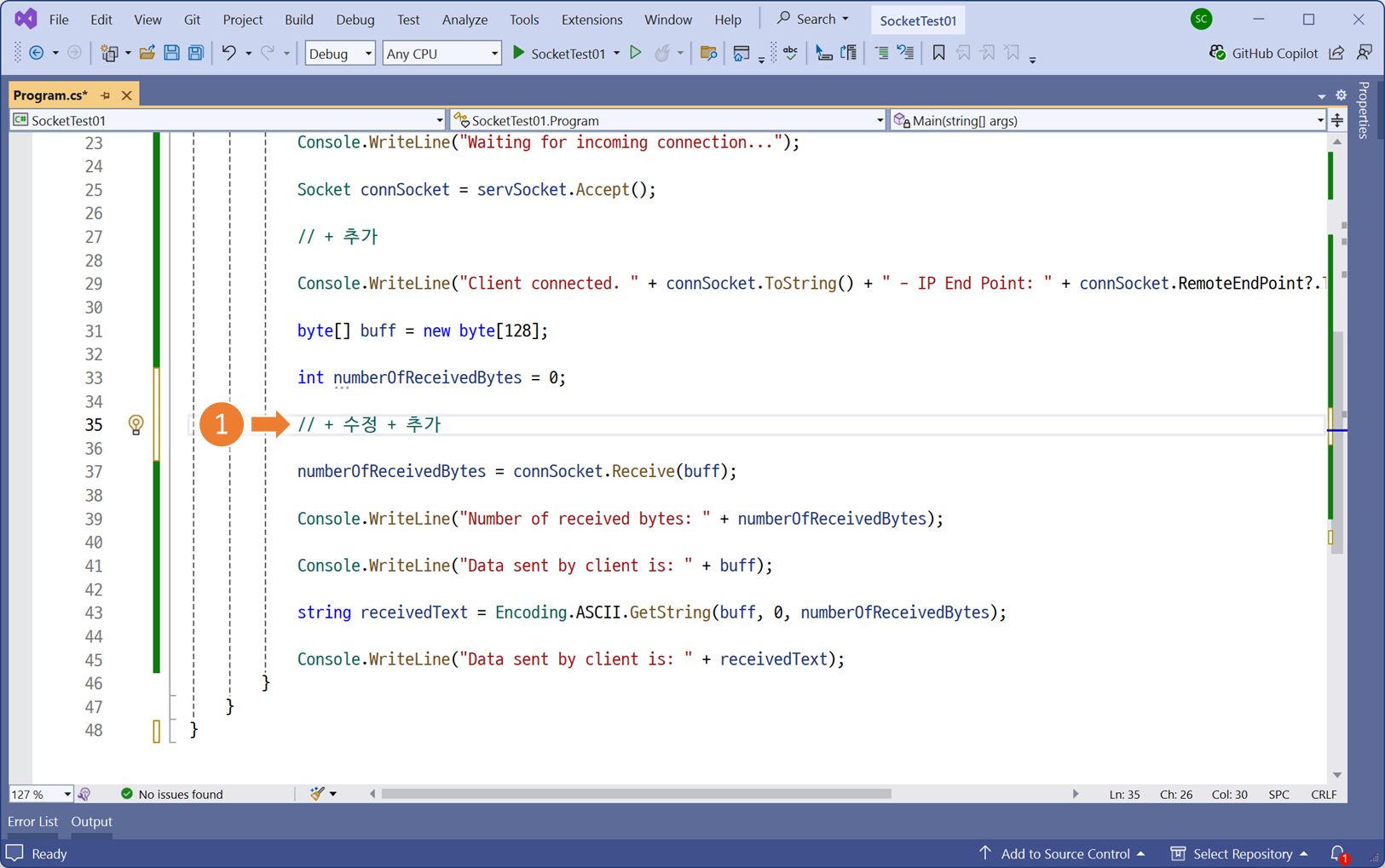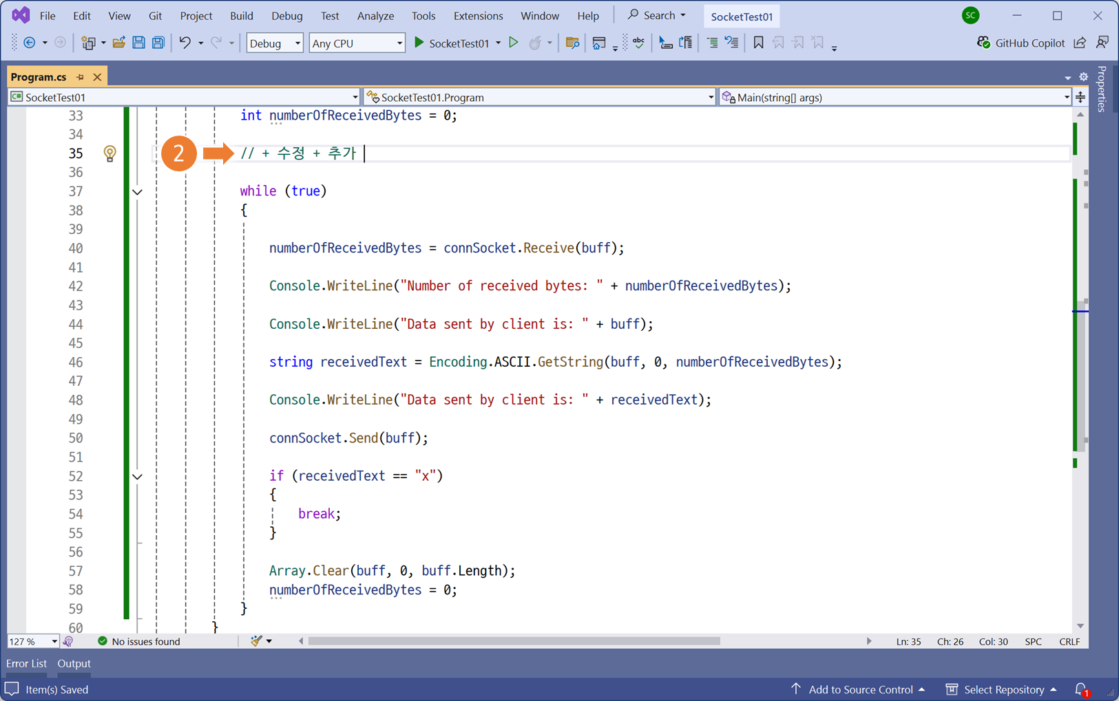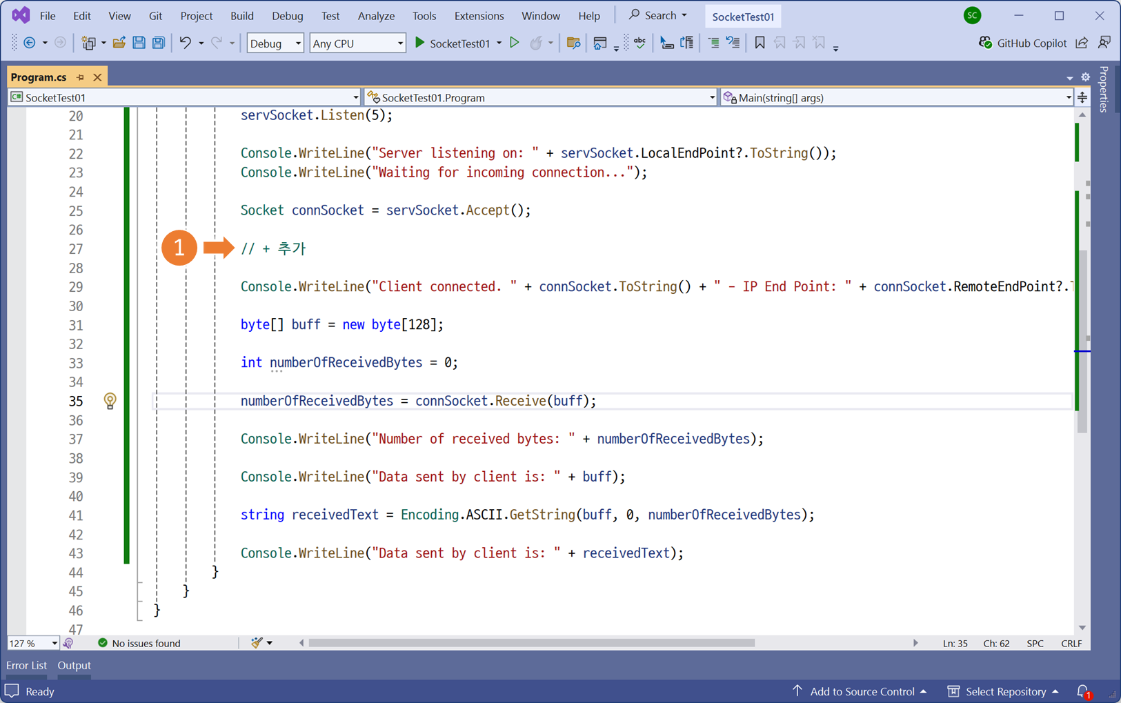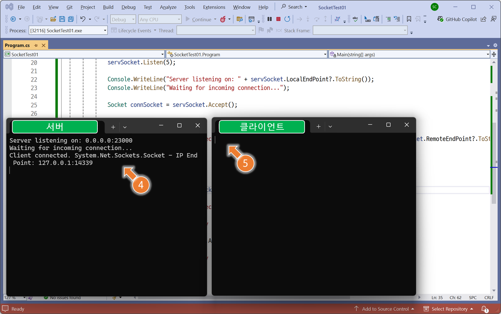 서버에, 클라이언트 연결 후 문자하나를 입력받는 코드를 추가합니다.