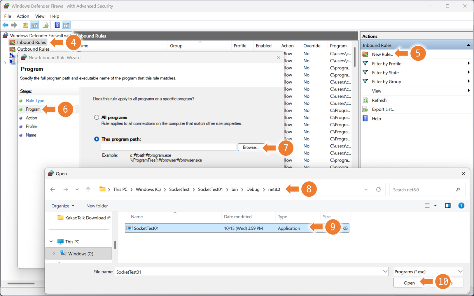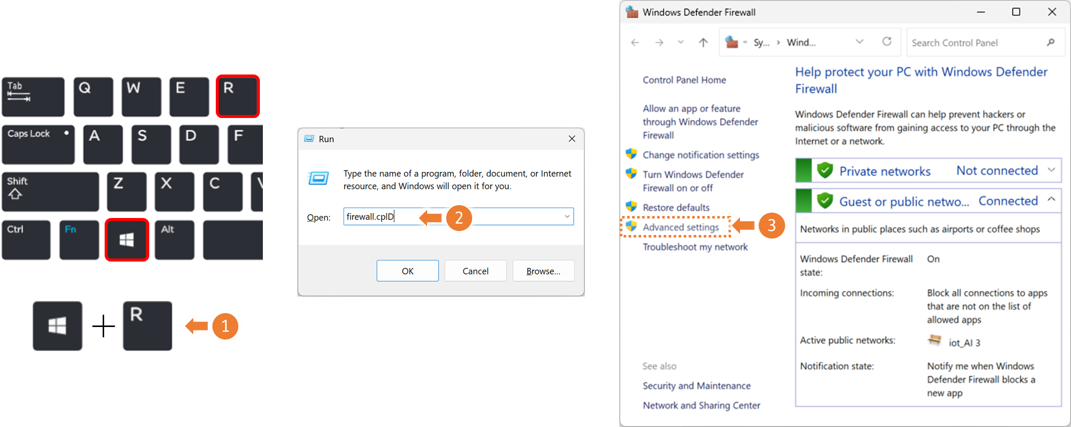 firewall.cpl 실행하여, 윈도우 방화벽 설정창에서 고급 설정을 실행한다.
