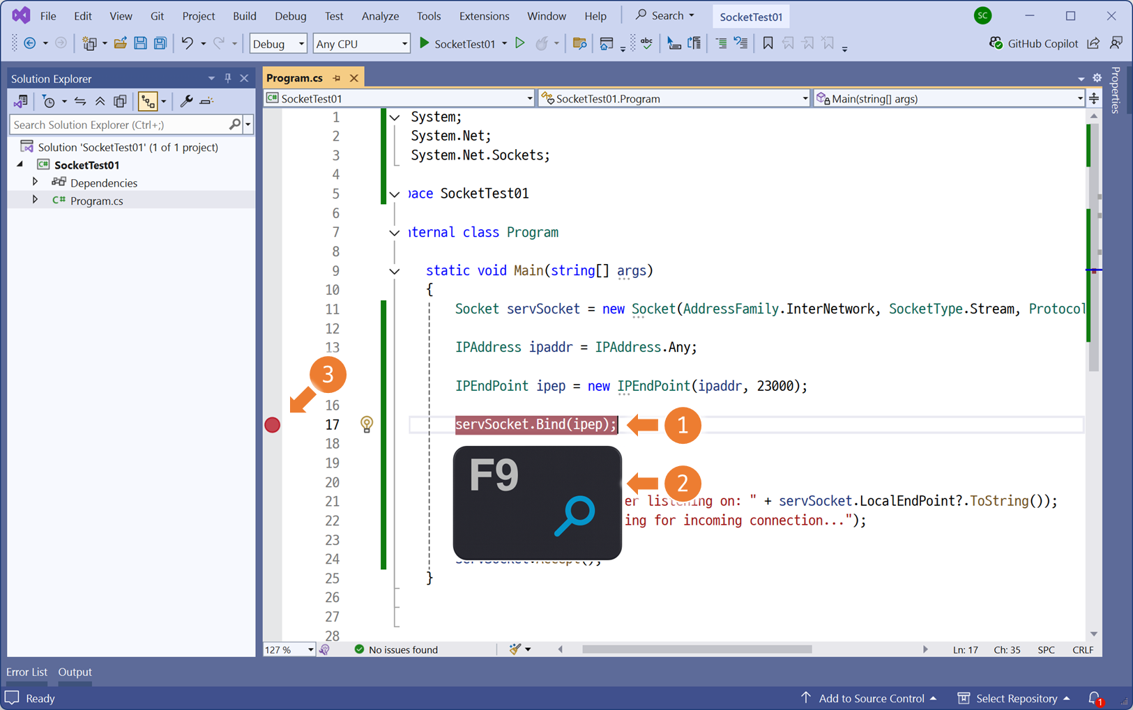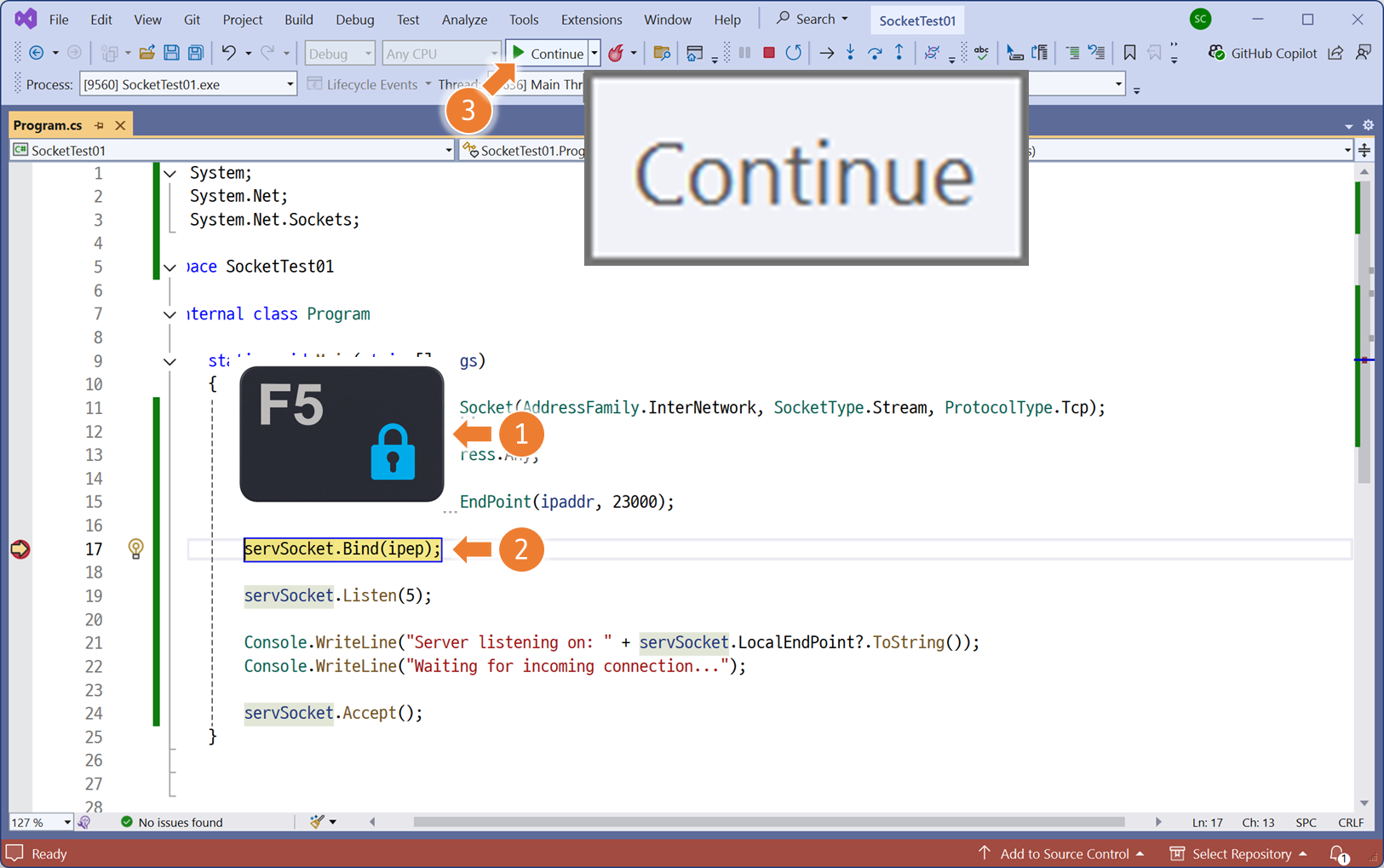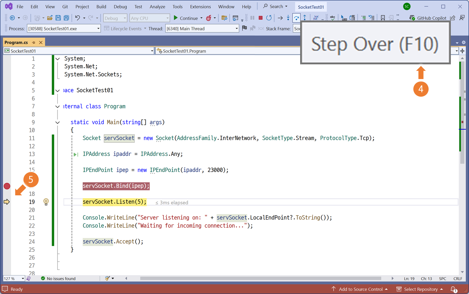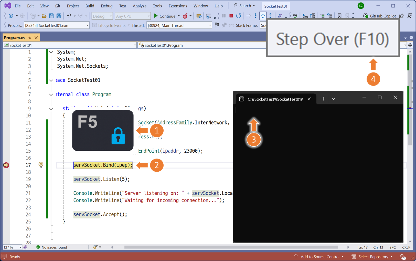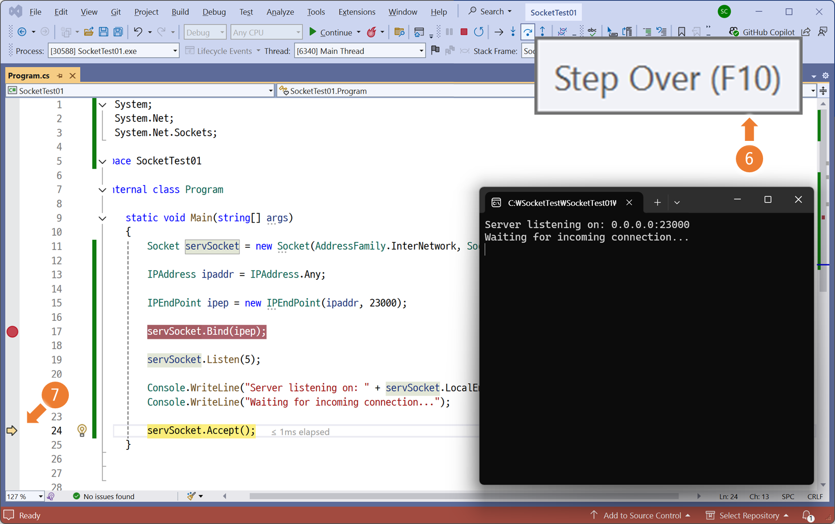 F5 키를 눌러, start debugging 을 시작하면, 중단점에서 실행이 멈춥니다.