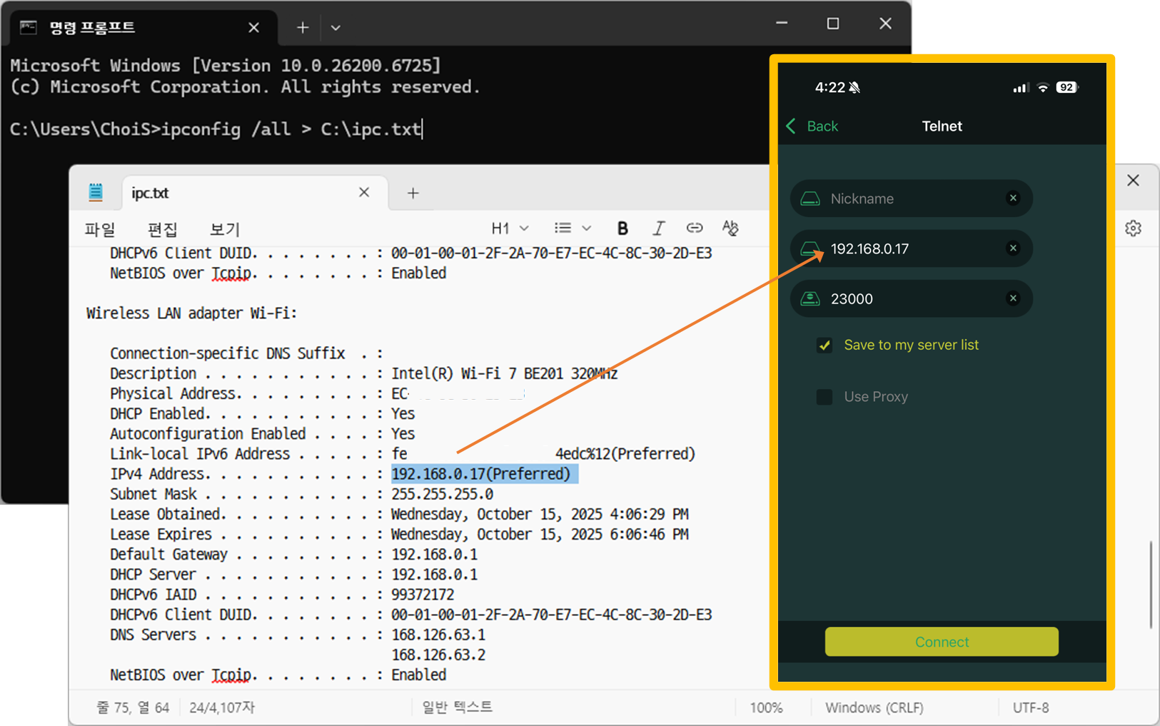 모바일에서 telnet 앱으로 검색하고, IP, Port 입력한다.