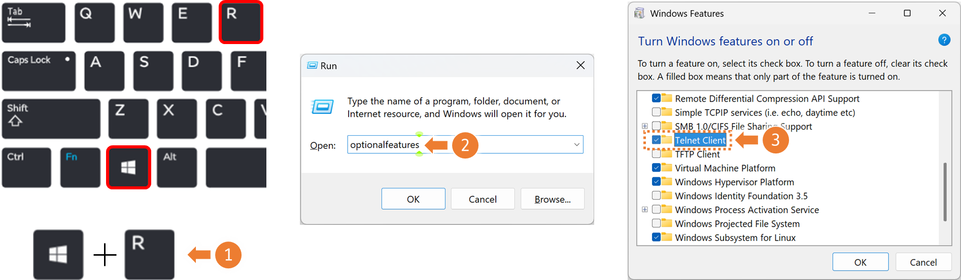 Win+R 단축키로 '실행' 창에 optionalfeatures 입력하고, 'telnet client'를 체크하여 활성화합니다.