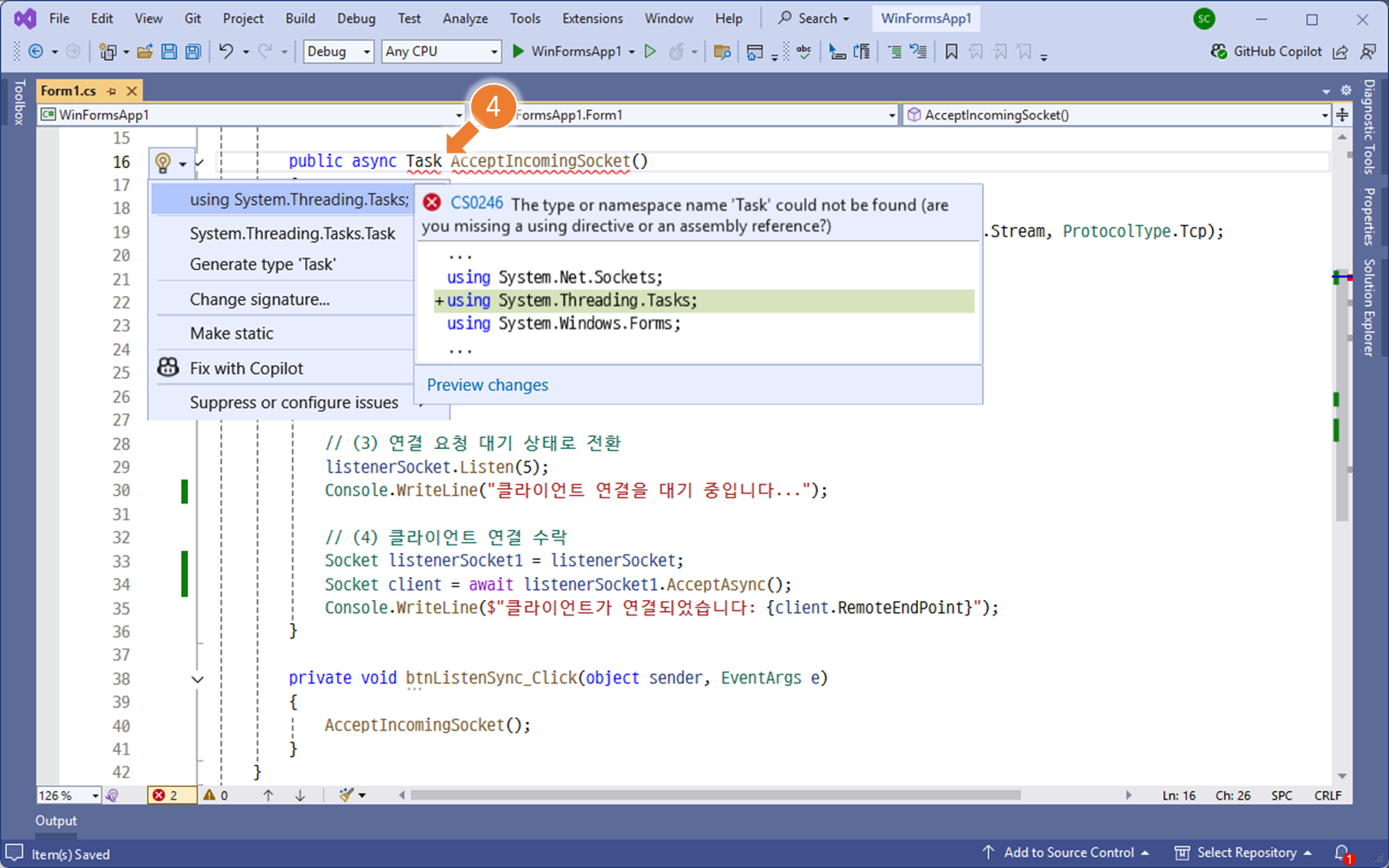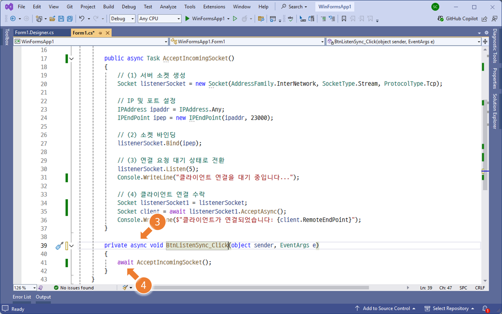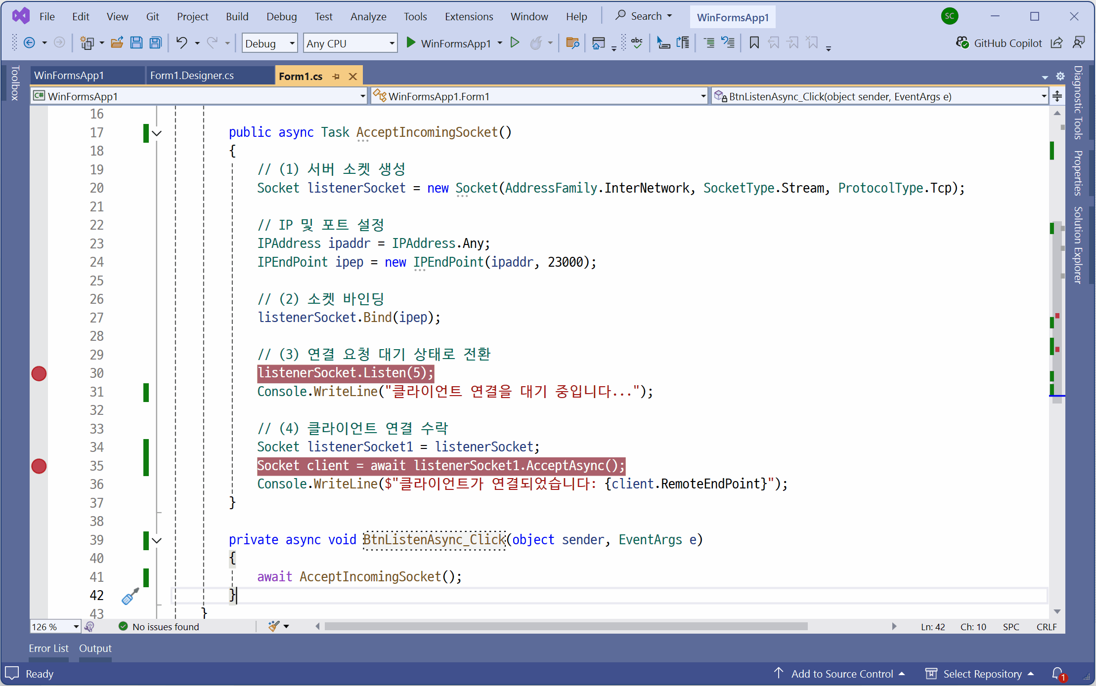 //Debug.WriteLine("클라이언트 연결을 대기 중입니다...");