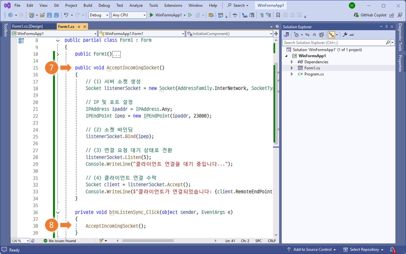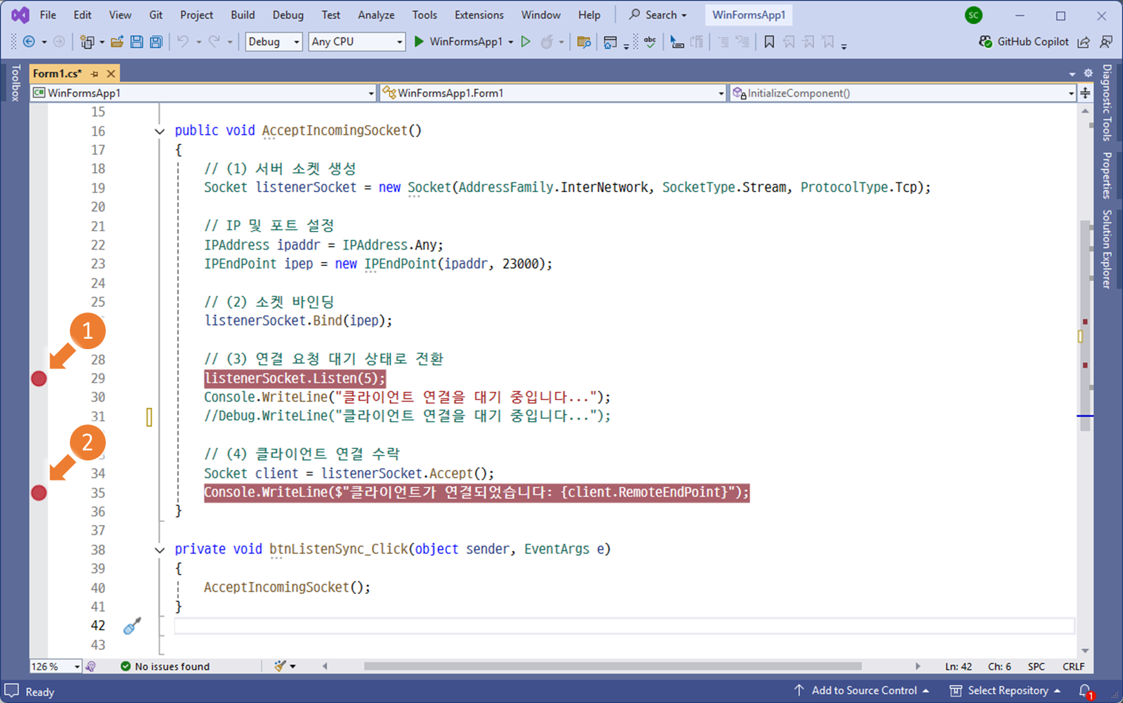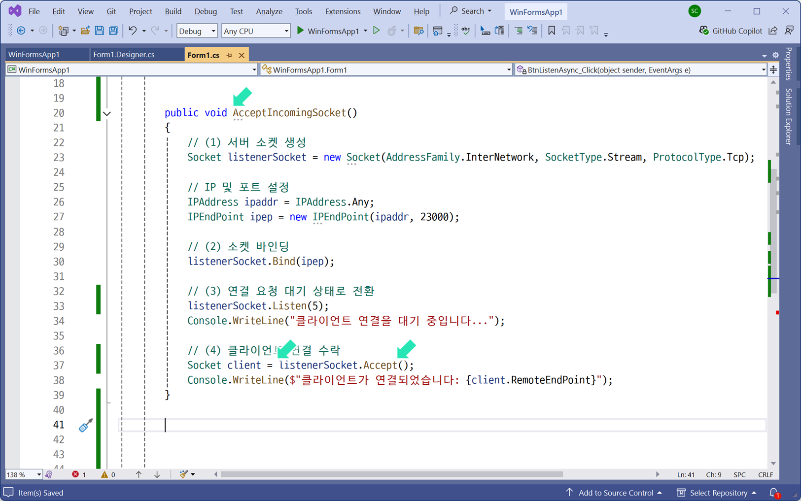 Console.WriteLine($"클라이언트가 연결되었습니다: {client.RemoteEndPoint}");