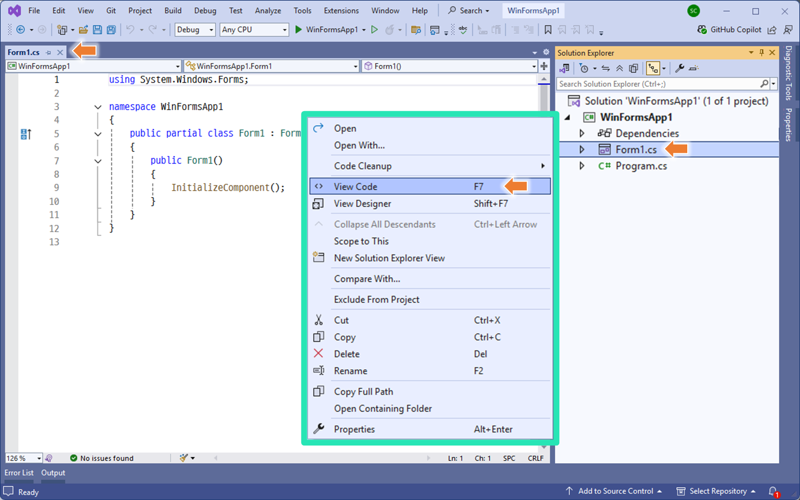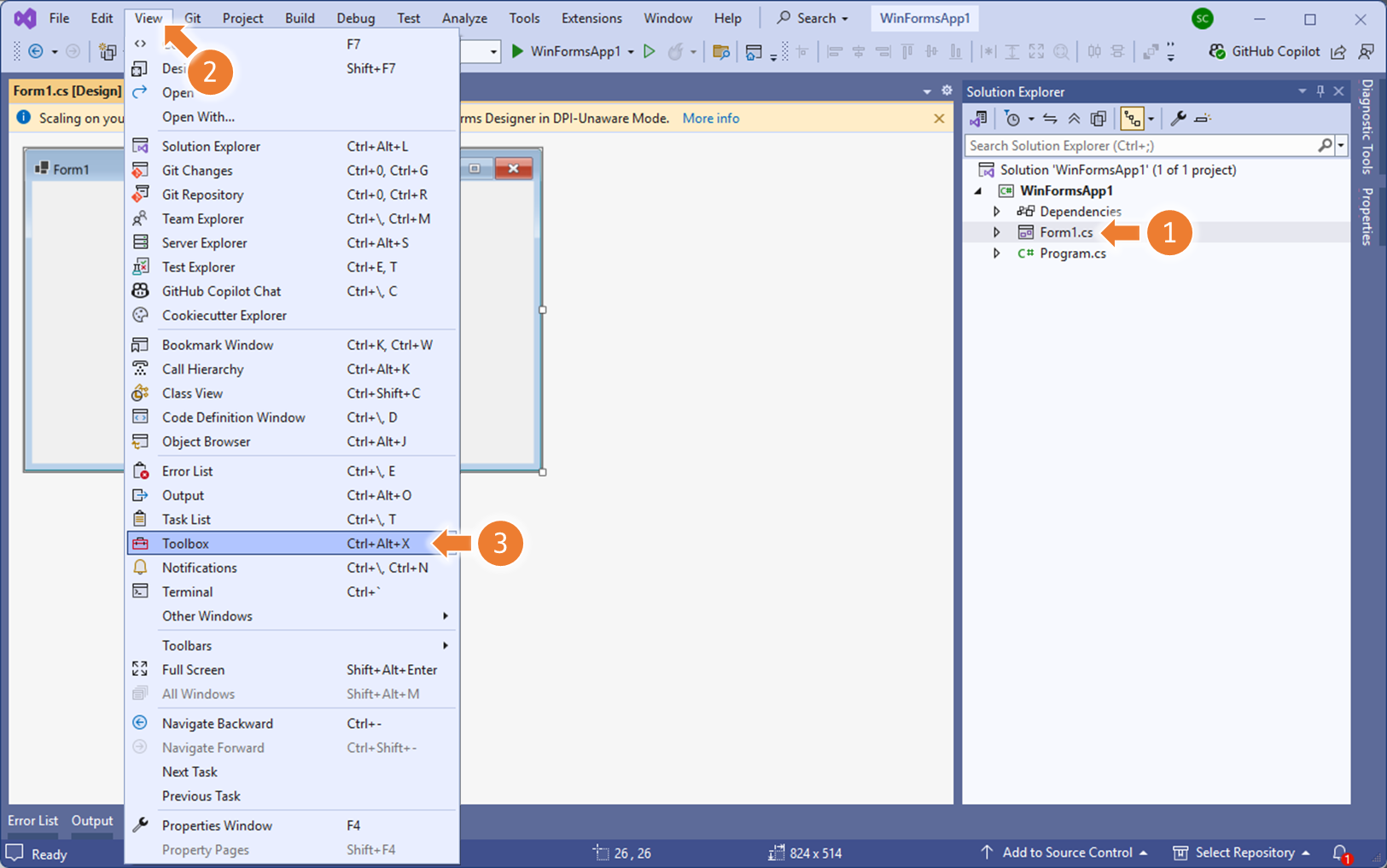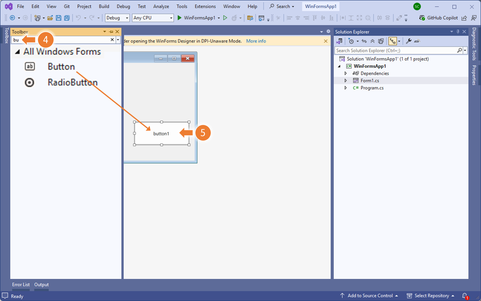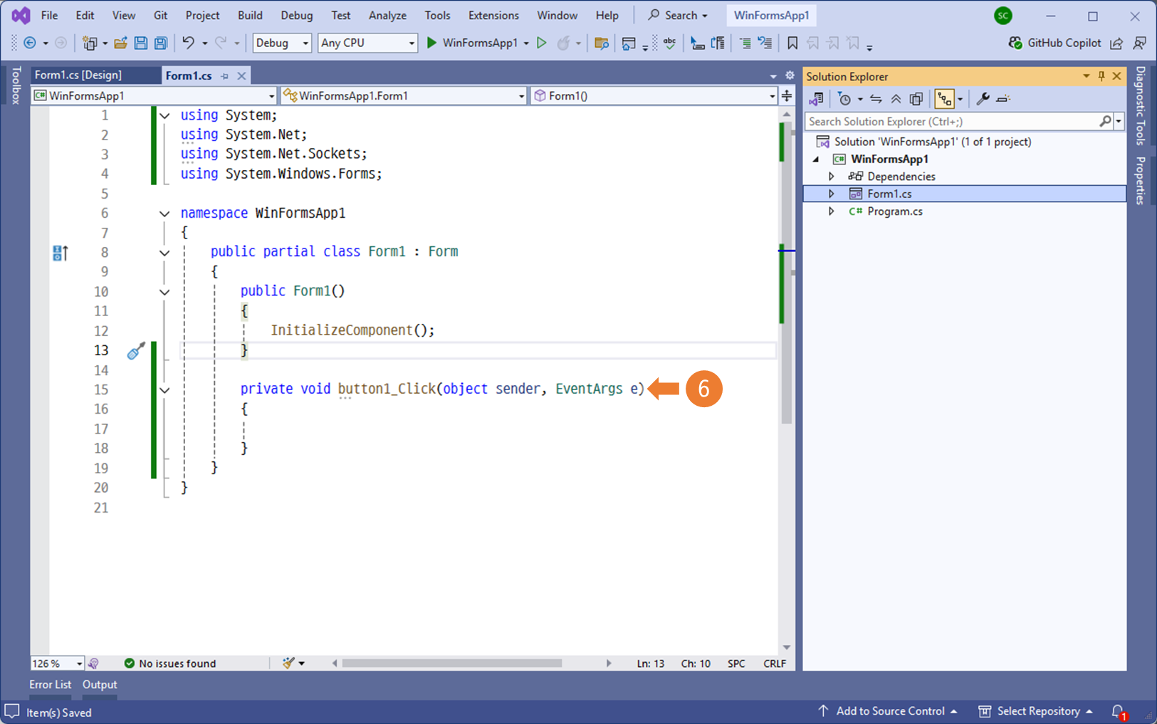 상단의 View 메뉴에서, ToolBox 를 선택합니다.ToolBox 에서 Button(버튼)을 검색하여, 폼 위에 올려리고, 버튼을 <더블클릭>합니다.버튼 이벤트가 생성됩니다.참고: 코드보기(F7)