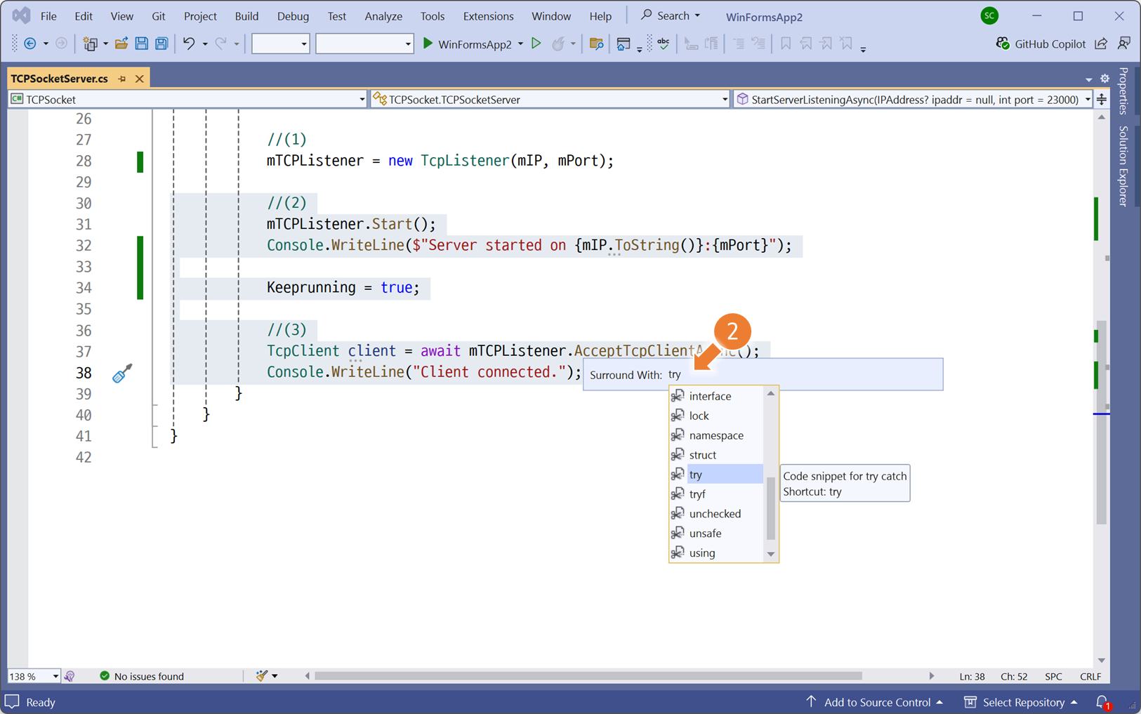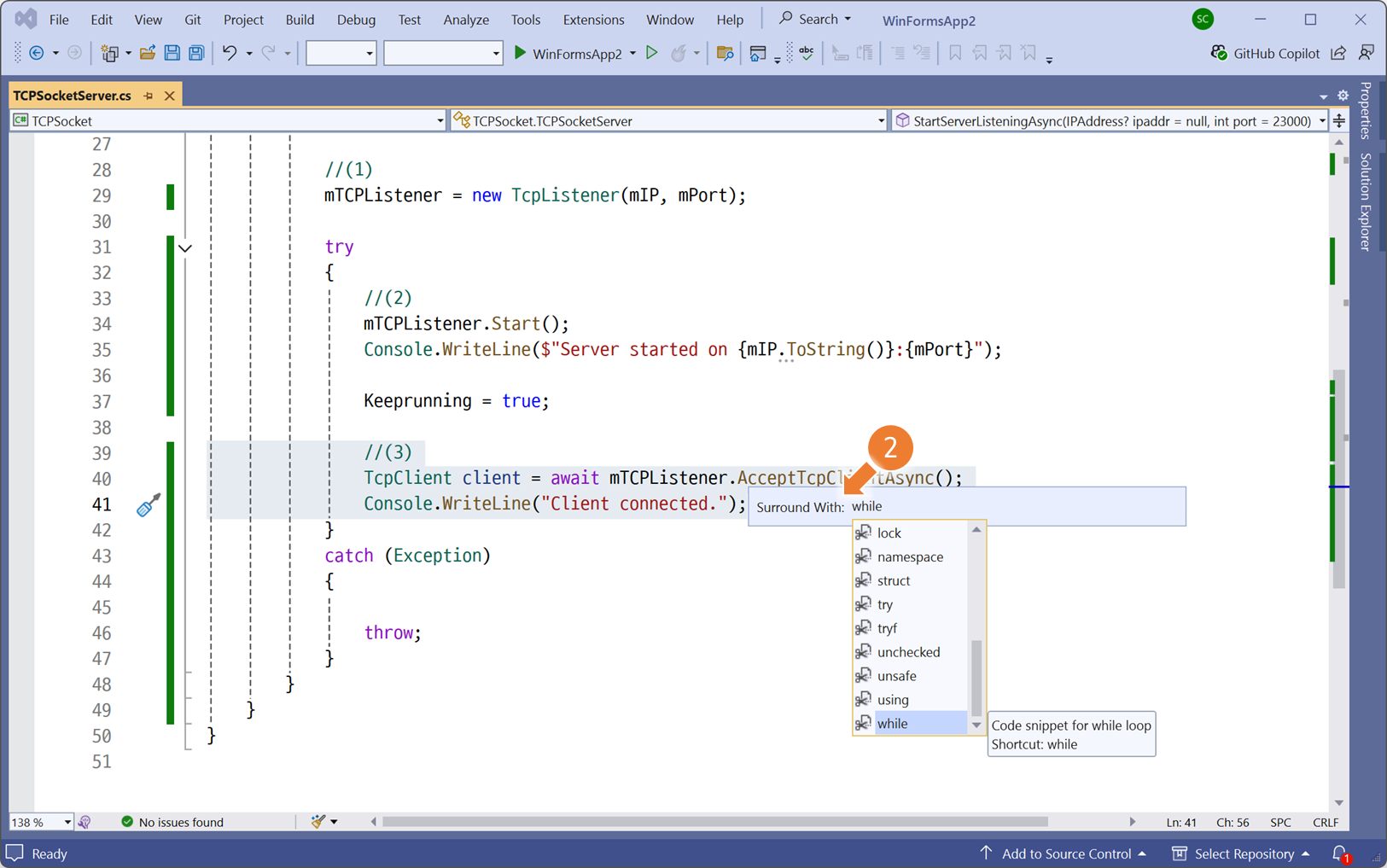 예외처리를 추가하기 위해 (2), (3) 번 동작에 블럭을 씌워줍니다.ctrl + k, ctrl + s 단축키를 통해 스니팻을 불러오고, <try> 키워드를 검색하여 실행합니다.try ~ catch 문이 적용되었습니다. catch 내용은 이전 포스트를 참고하여 구현합니다.