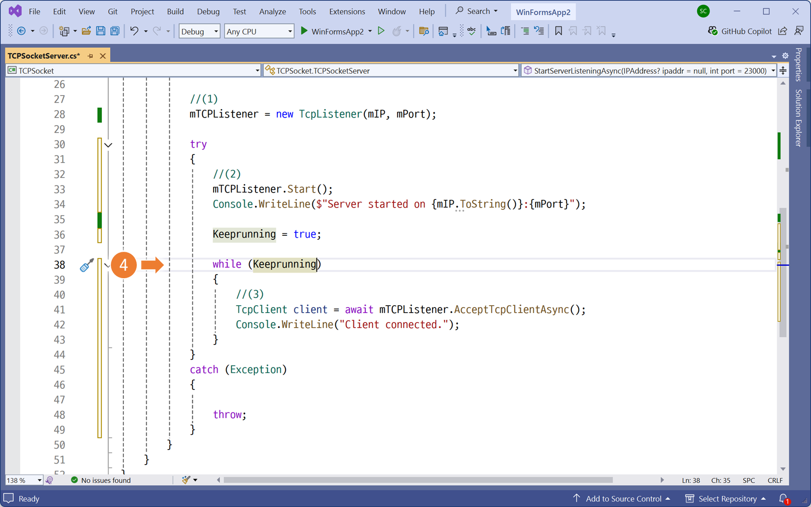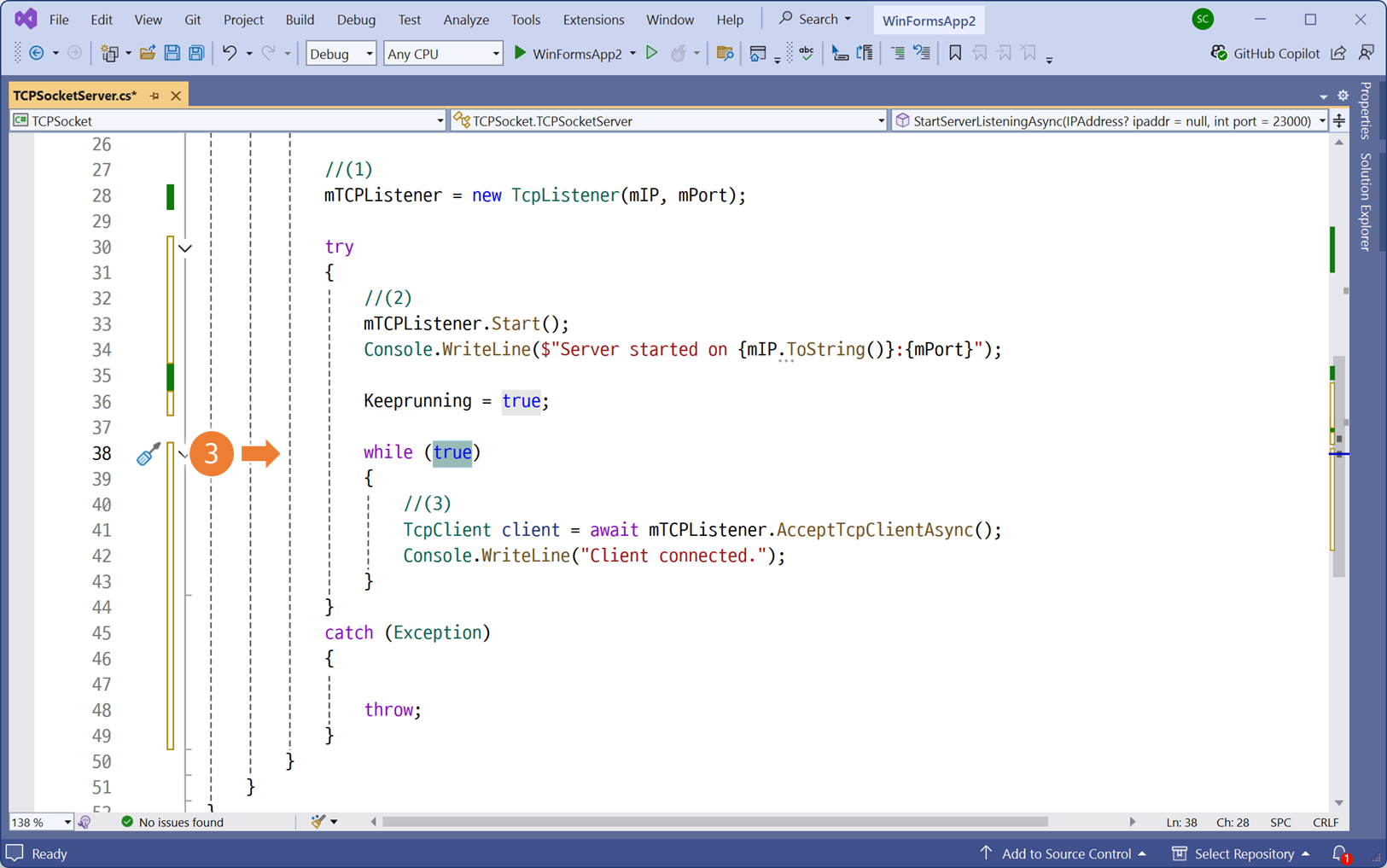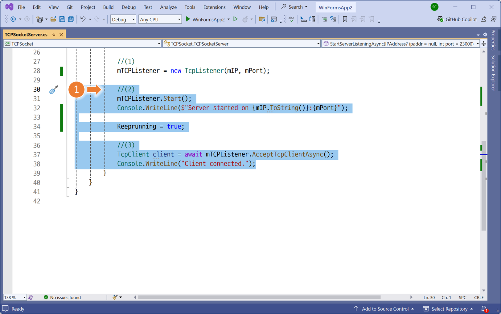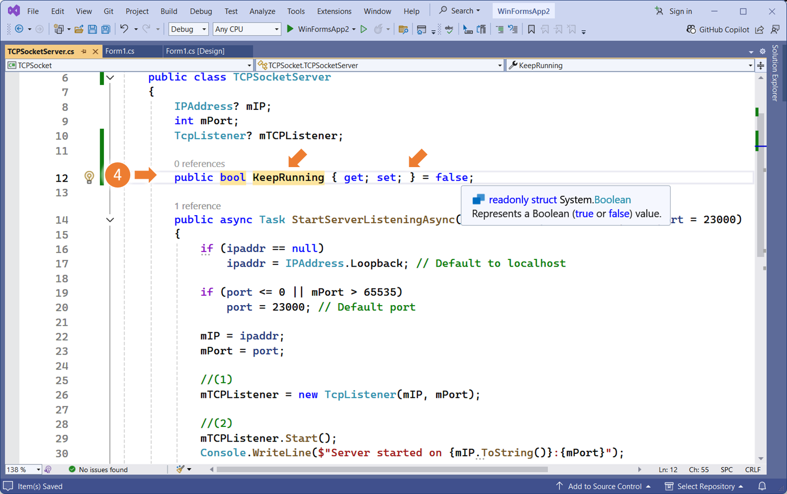 클래스 라이브러리의 서버 구현체로 이동합니다.서버 동작을 구분할 식별자를 <프로퍼티 자동완성> 으로 생성bool 자료형 입력KeepRunning 프로퍼티의 초기값을 false로 지정위에서 생성한 식별자는, 서버가 동작중임을 의미합니다.서버가 정상적으로 시작되는 위치에, KeepRunning 프로퍼티의 초기값을 True 로 변경합니다.