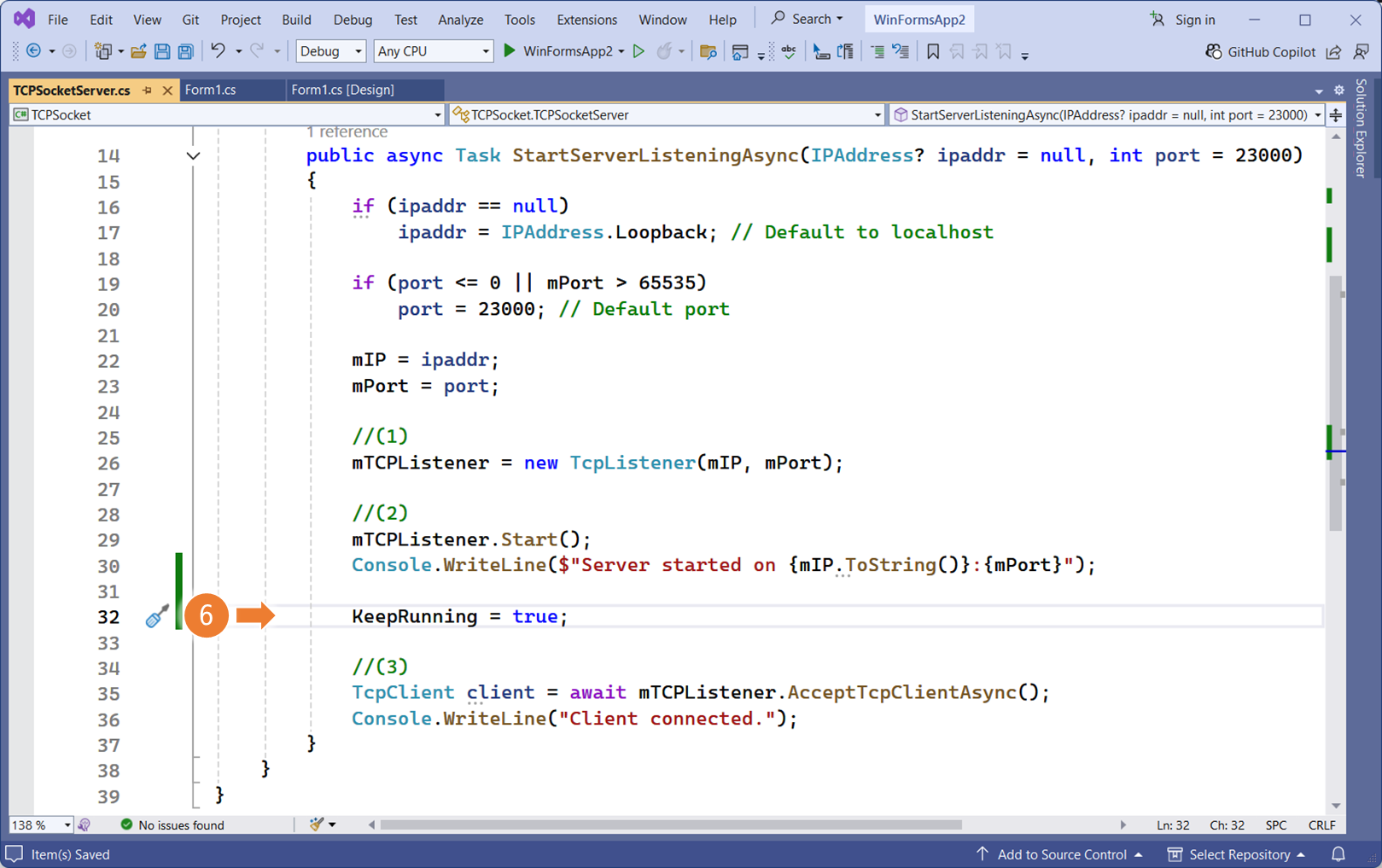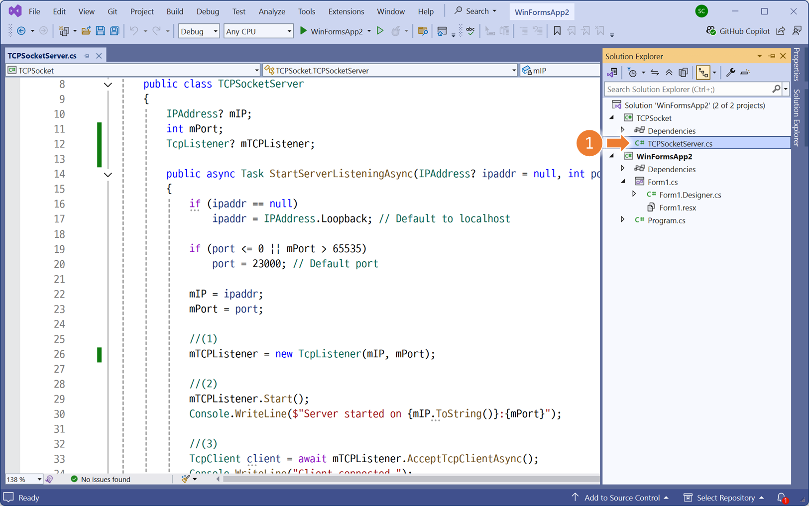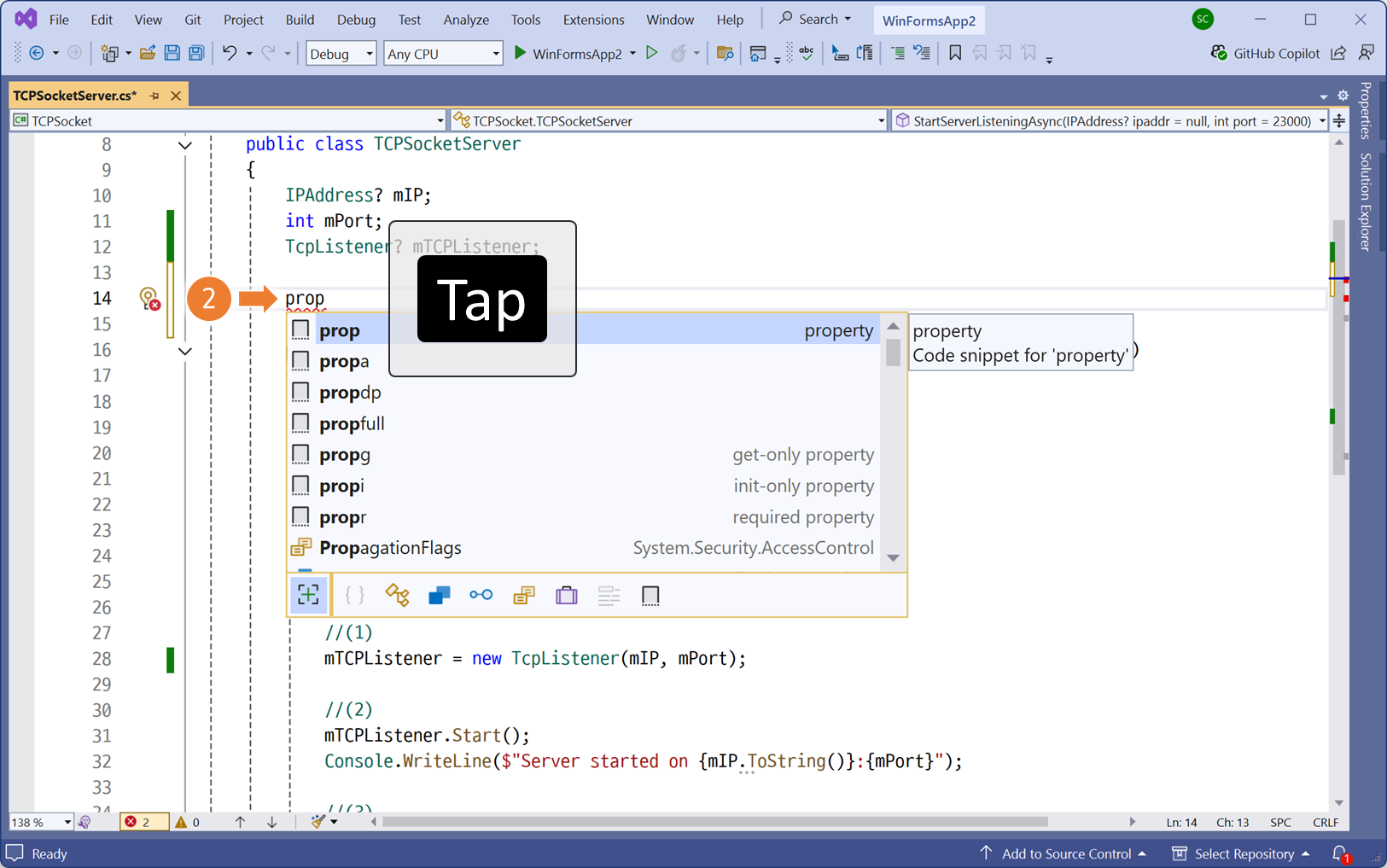 클래스 라이브러리의 서버 구현체로 이동합니다.서버 동작을 구분할 식별자를 <프로퍼티 자동완성> 으로 생성bool 자료형 입력KeepRunning 프로퍼티의 초기값을 false로 지정위에서 생성한 식별자는, 서버가 동작중임을 의미합니다.서버가 정상적으로 시작되는 위치에, KeepRunning 프로퍼티의 초기값을 True 로 변경합니다.