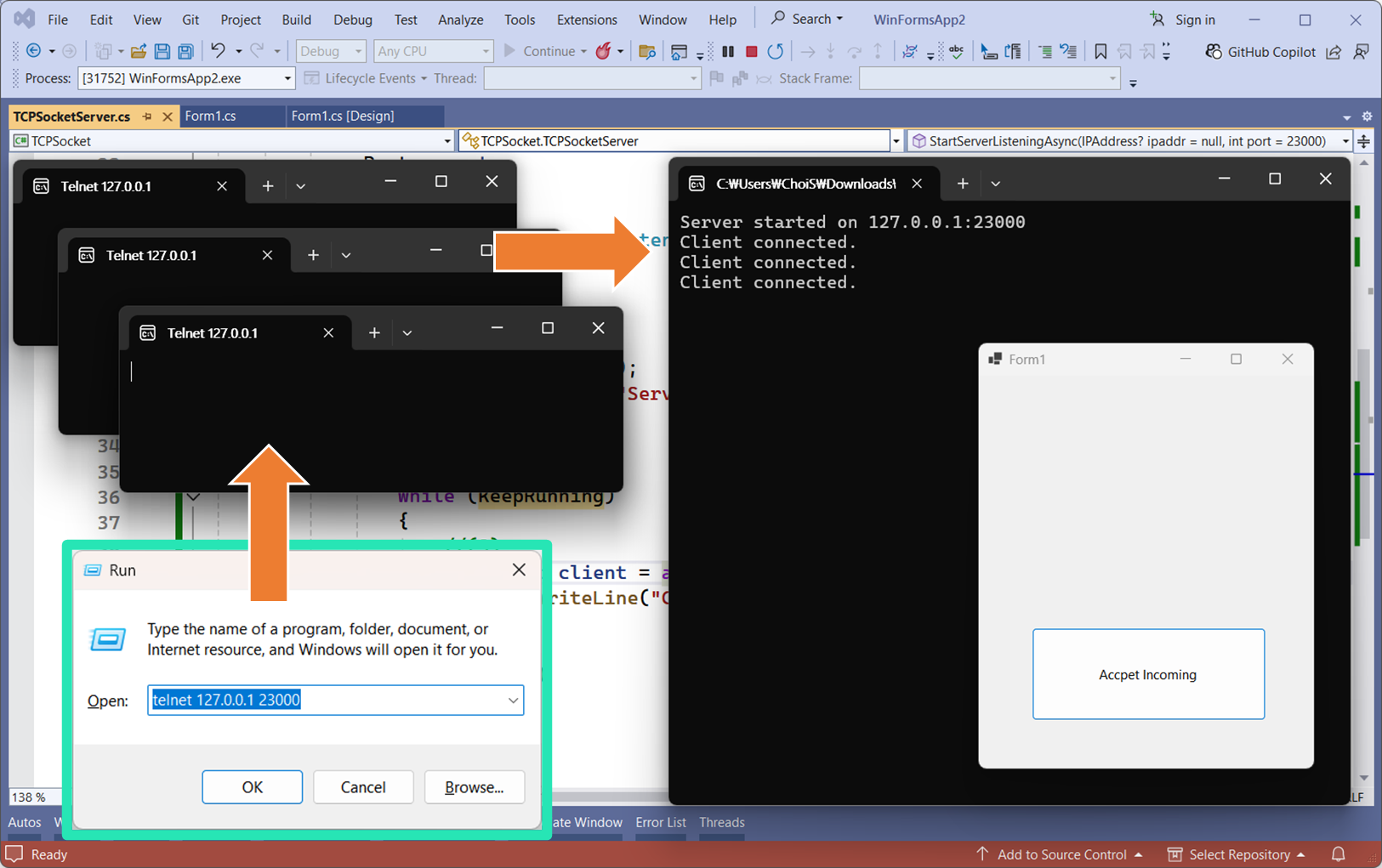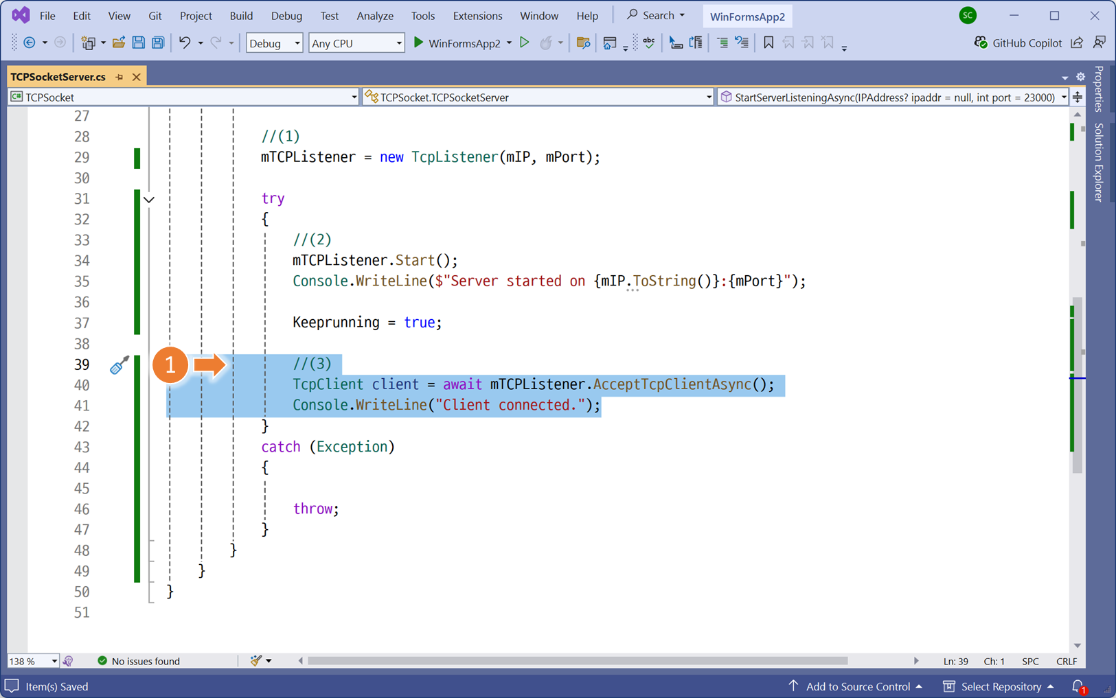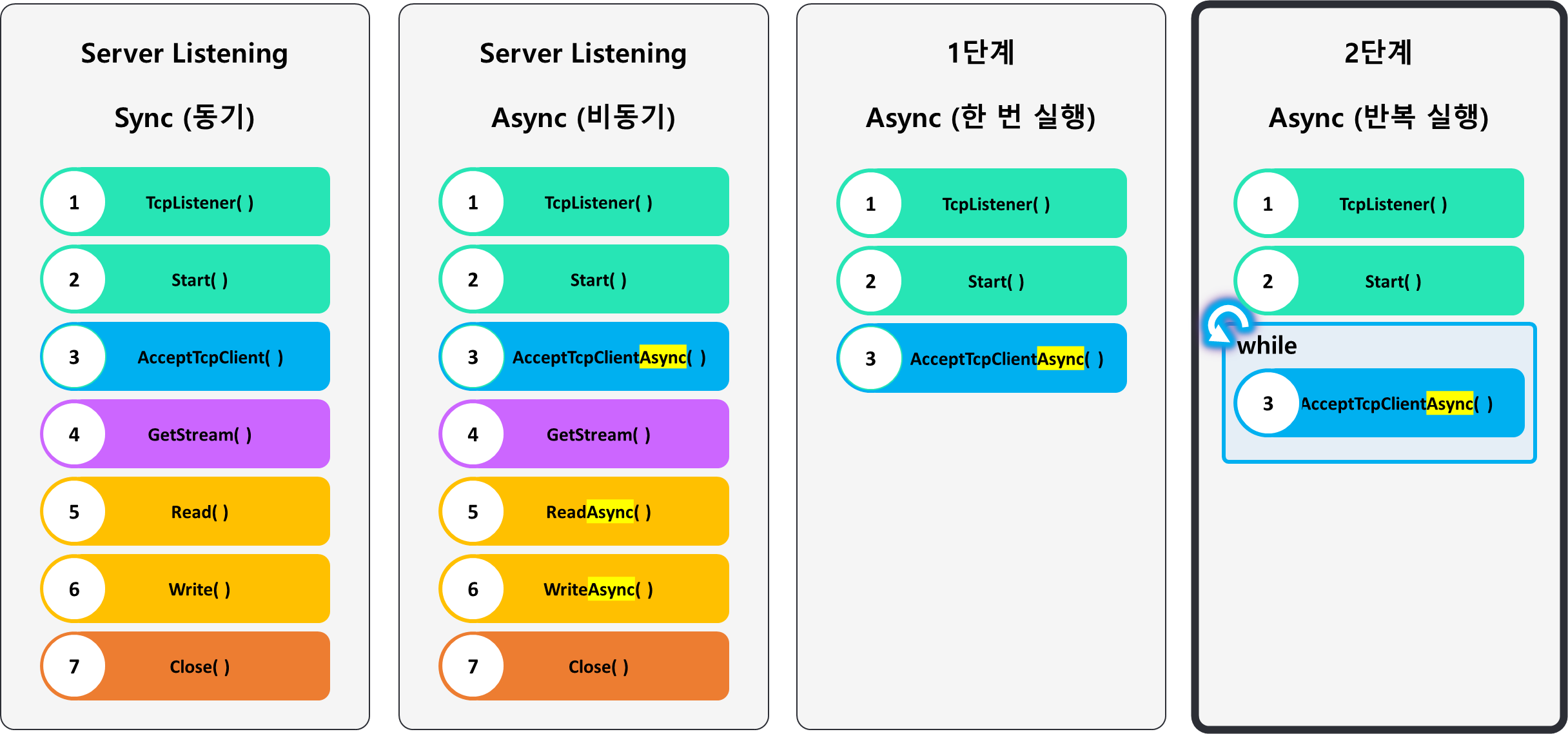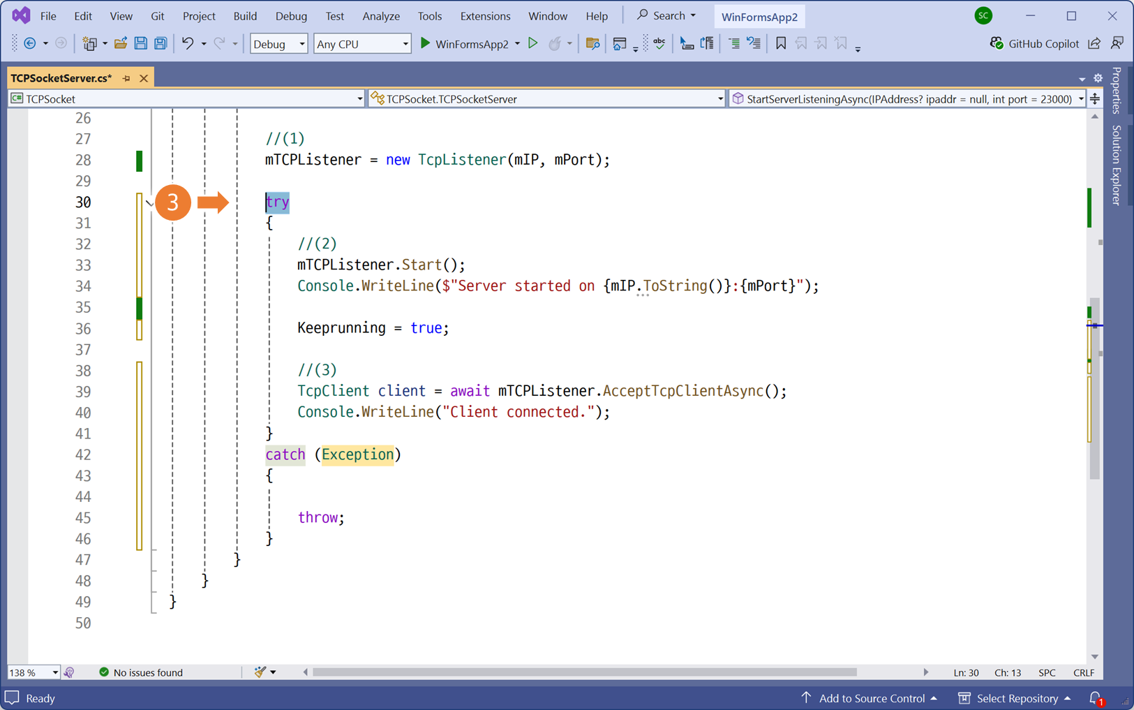 클래스 라이브러리의 서버 구현체로 이동합니다.서버 동작을 구분할 식별자를 <프로퍼티 자동완성> 으로 생성bool 자료형 입력KeepRunning 프로퍼티의 초기값을 false로 지정위에서 생성한 식별자는, 서버가 동작중임을 의미합니다.서버가 정상적으로 시작되는 위치에, KeepRunning 프로퍼티의 초기값을 True 로 변경합니다.