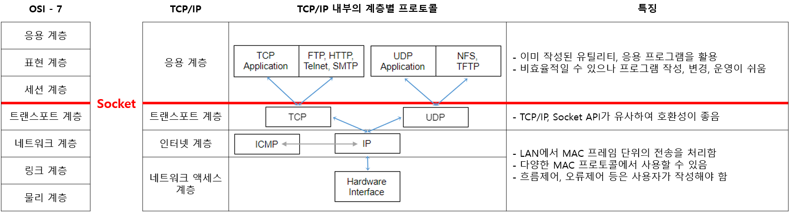 2. 트랜스포트, 인터넷 계층 프로그래밍 ▶ 트랜스포트 계층을 이용해 호스트 종점간의 연결을 직접 관리하고 패킷 단위의 데이터 송수신을 제어 ▶ 대표적으로 Socket API(Application Program Interface)를 이용 ▶ 소켓 API는 운영체제에 따라 UNIX BSD(Berkeley Software Distribution) socket(1982년), 윈도우 소켓(Winsock, 1992년) 등이 있으며, 현재는 컴퓨터 기종 및 운영체제에 무관하게 대부분의 TCP/IP를 제공하는 컴퓨터에서는 기본적으로 지원