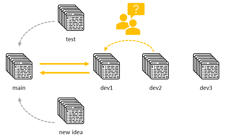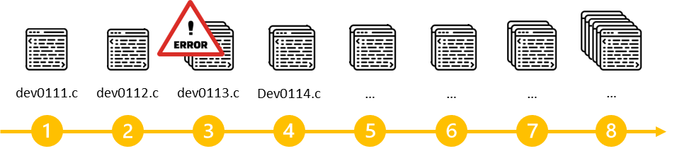 - 개발자1 : source01.c 에서 "ABC" 작업 후 → dev1에 반영, "ABC" 예상