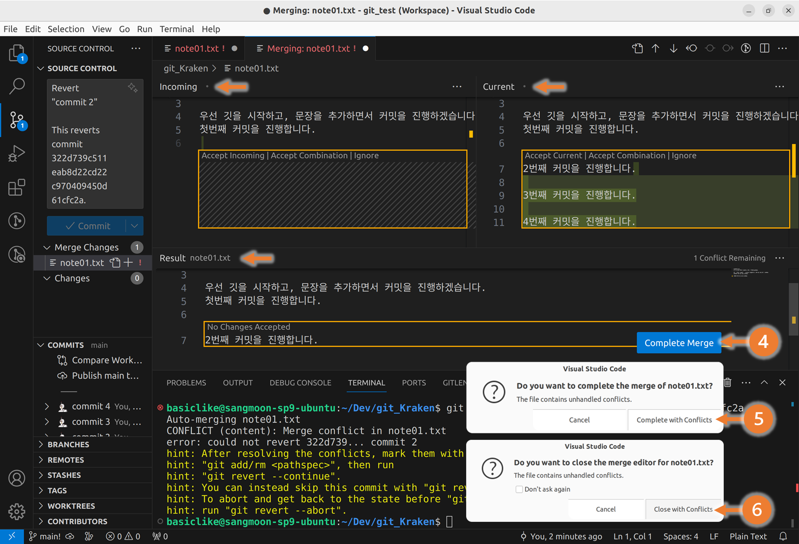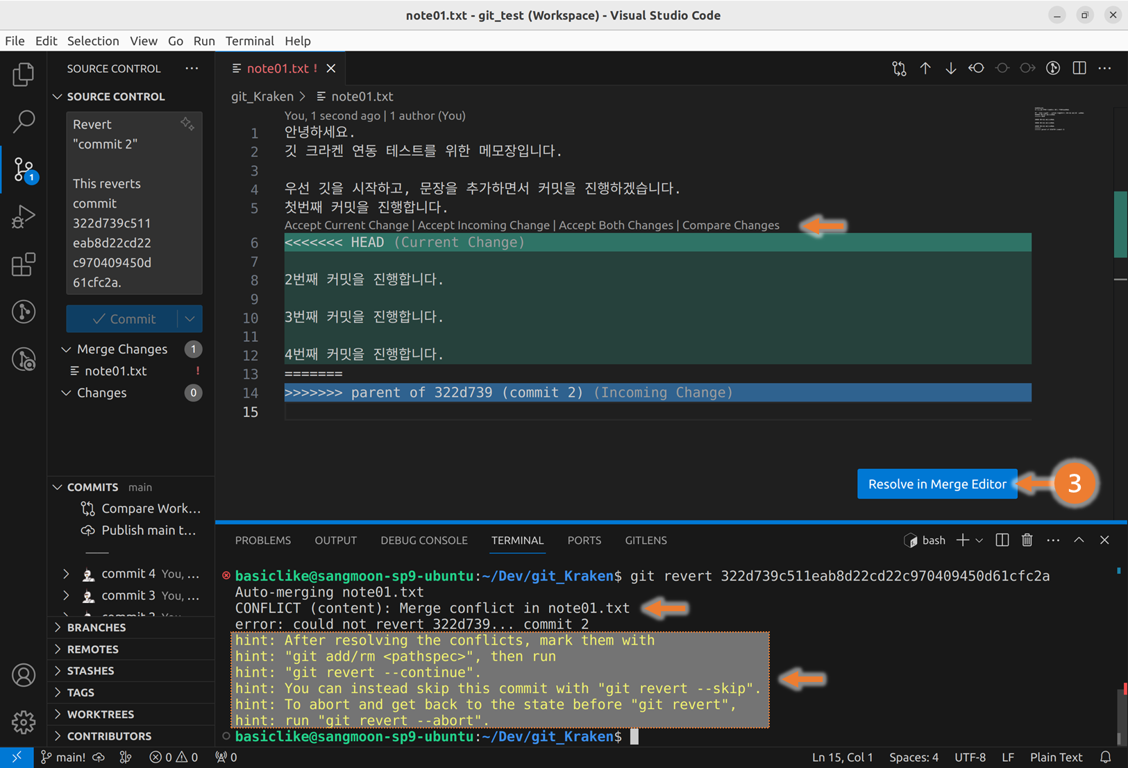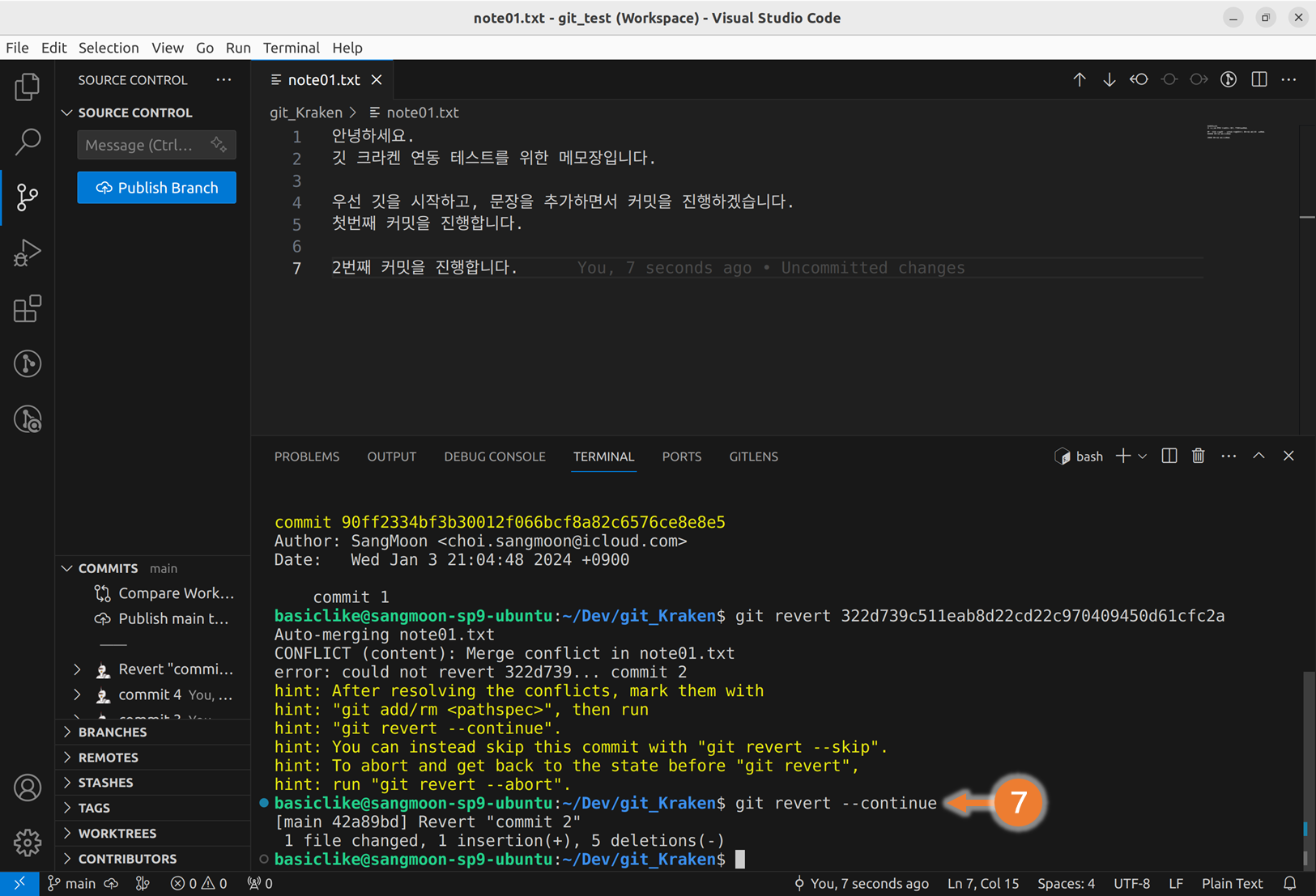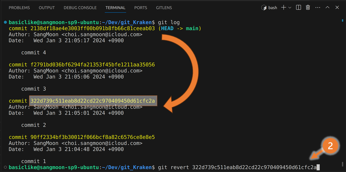 - revert 명령어는, 과거의 특정 커밋 시점으로 추가 커밋(저장)됩니다.