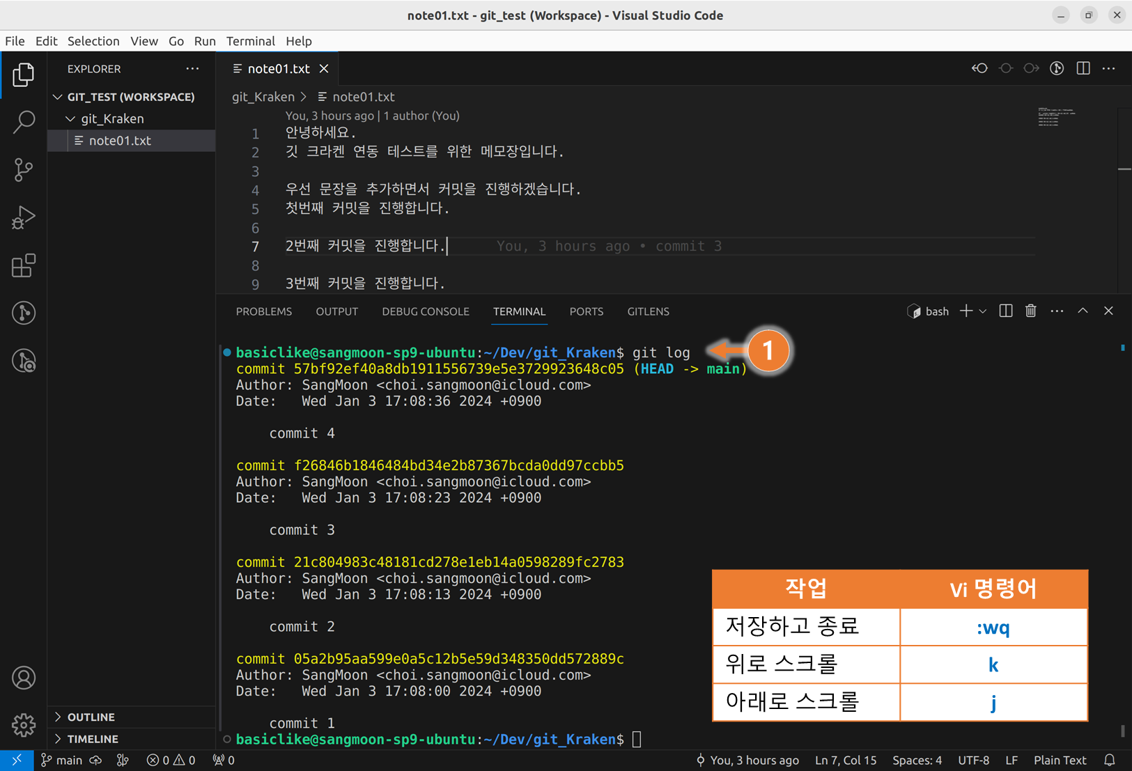 - 터미널은 vi 에디터로 열리게 되면, k, j 로 이동하고, :wq 명령어로 저장 종료 가능하다.