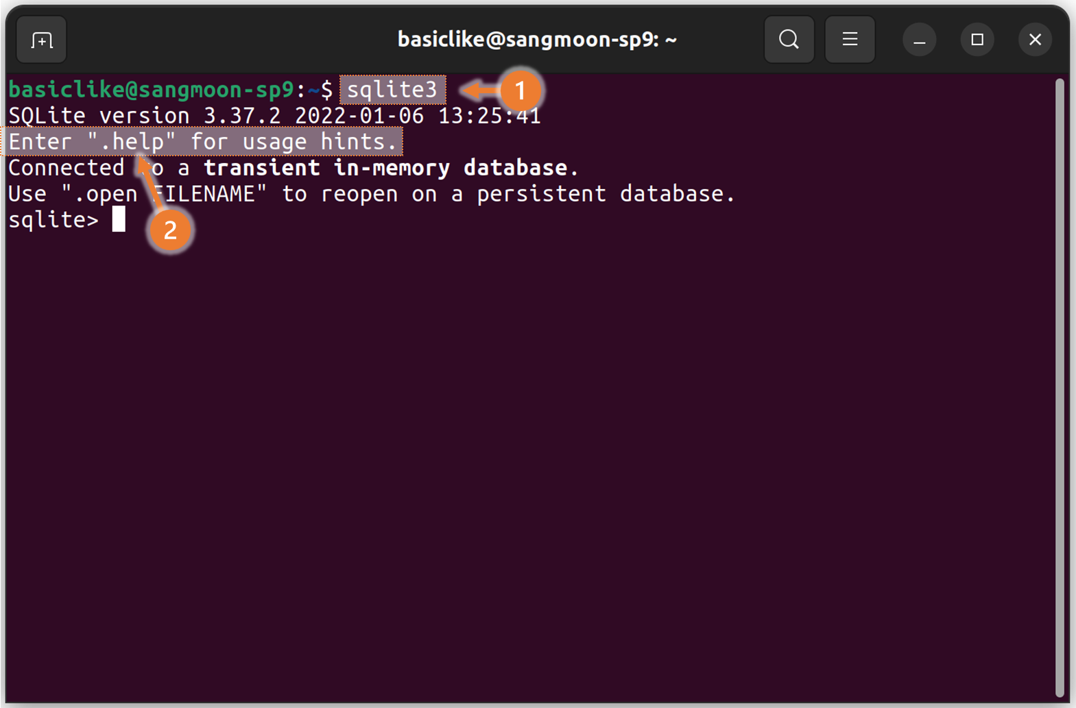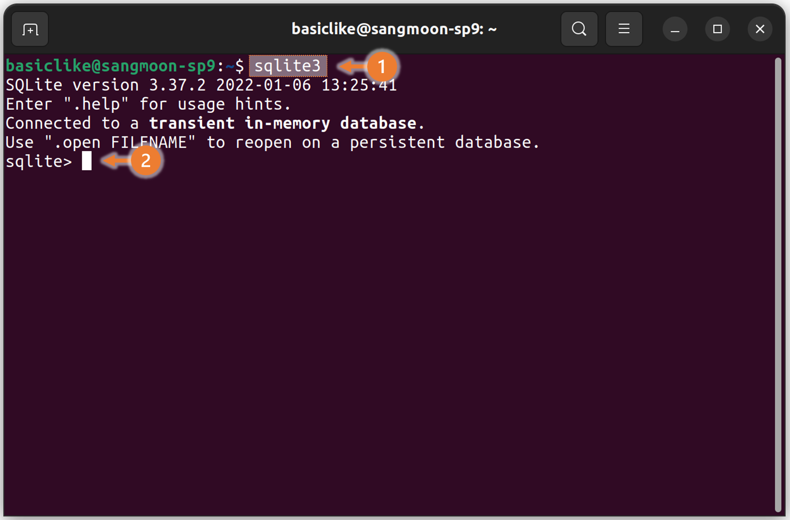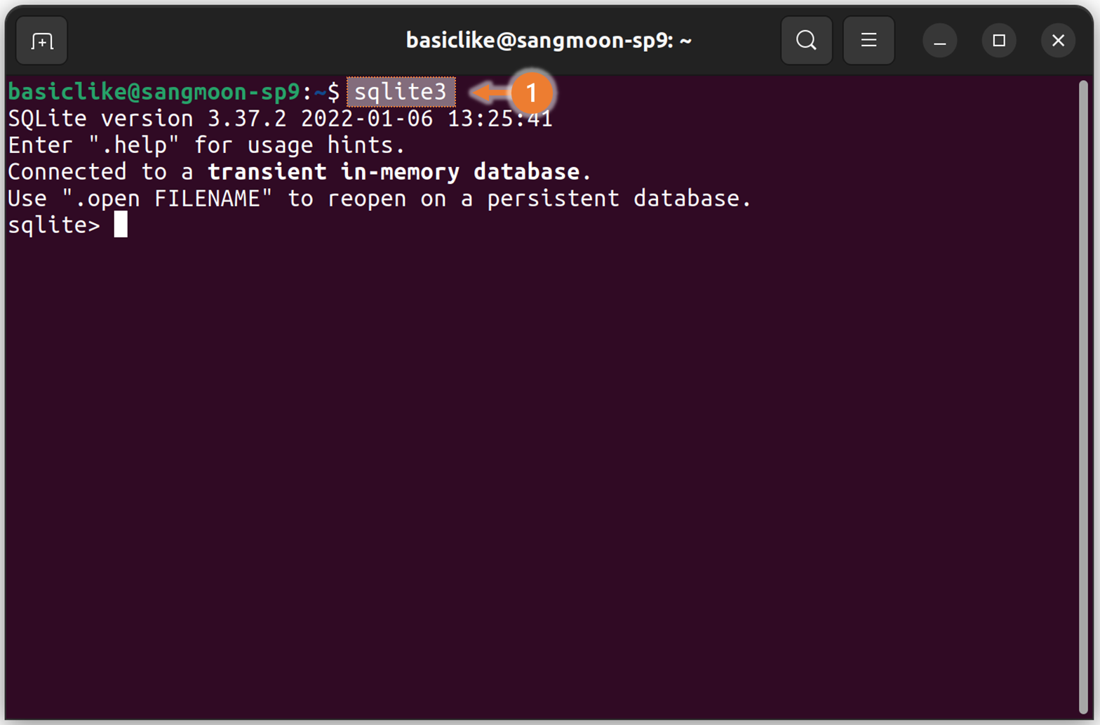 터미널에서 sqlite3 를 명령어를 입력하여 sqlite 쉘을 실행시킵니다.