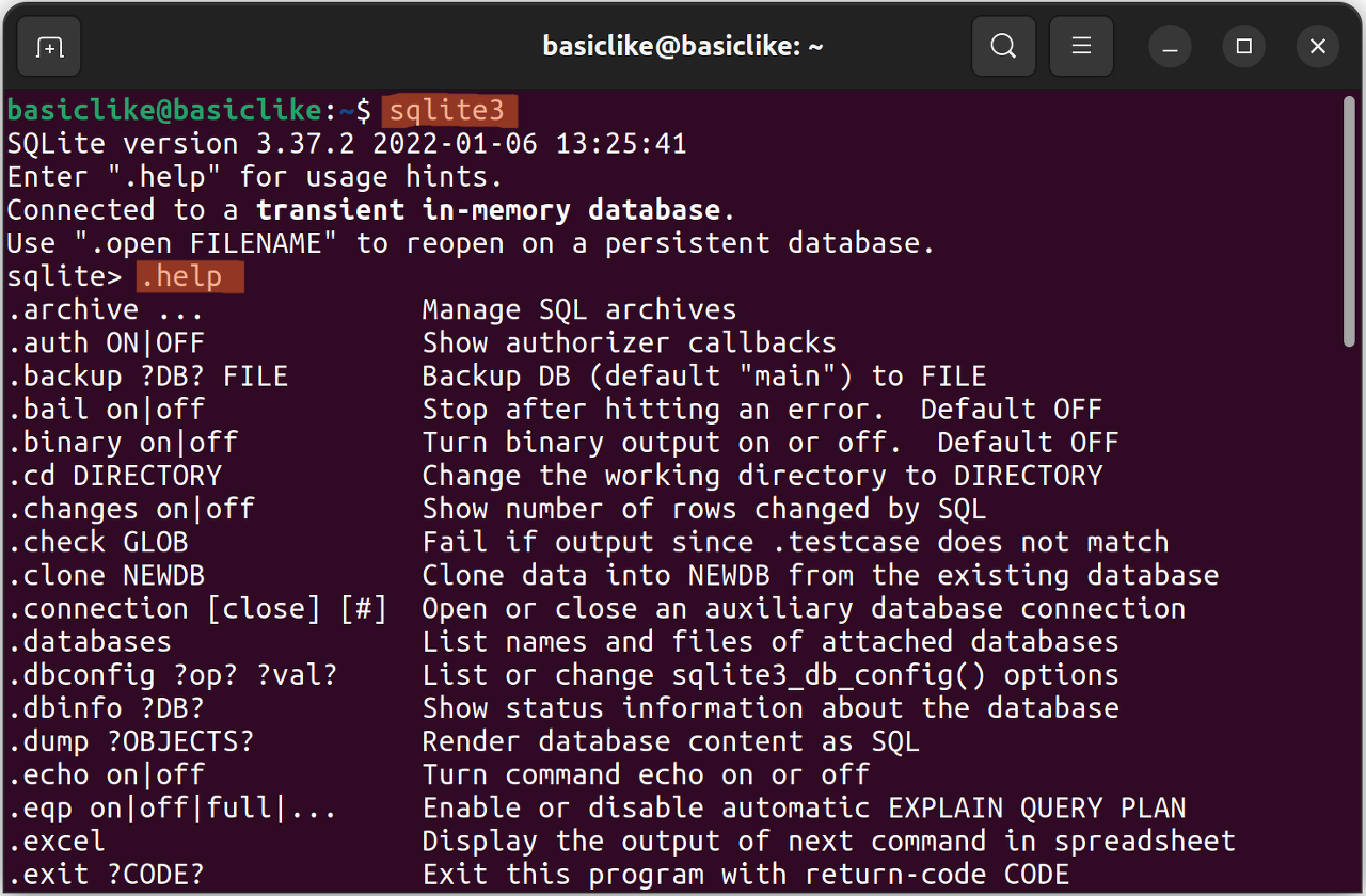 SQLite3 에서 사용 가능한 모든 명령어를 확인하려면 .help 를 입력합니다.